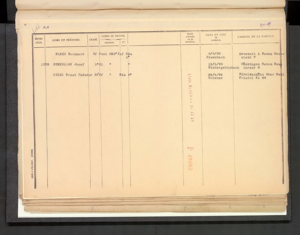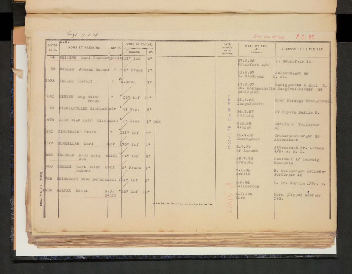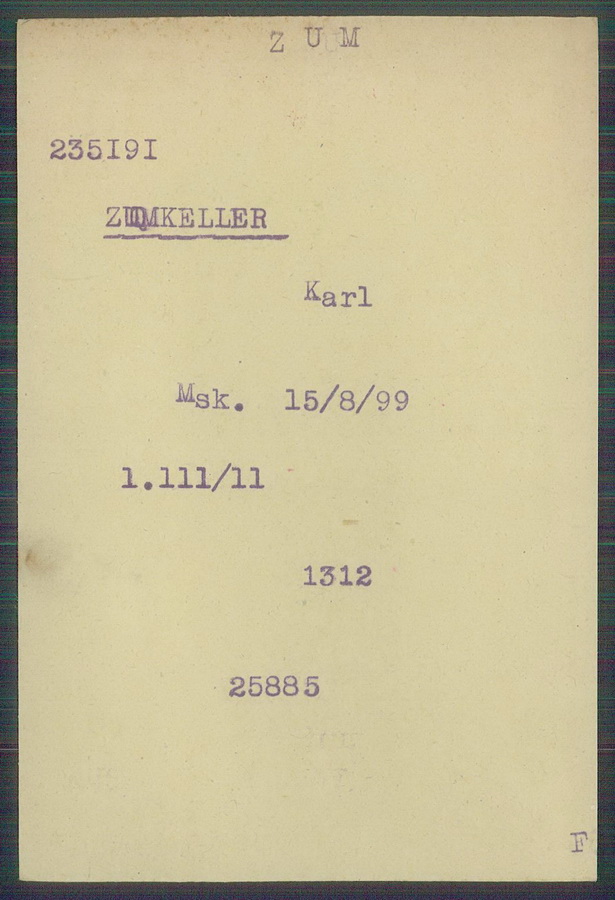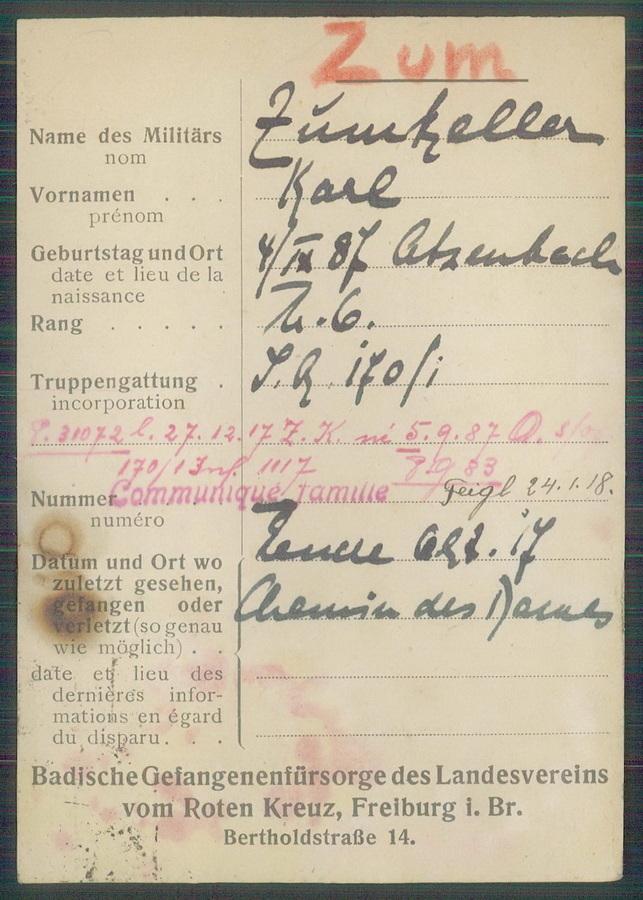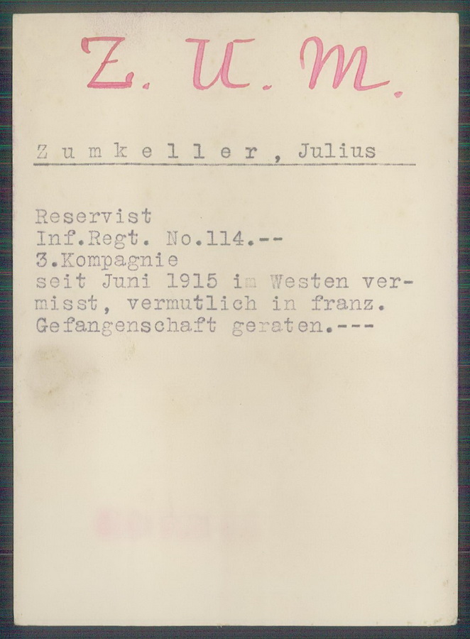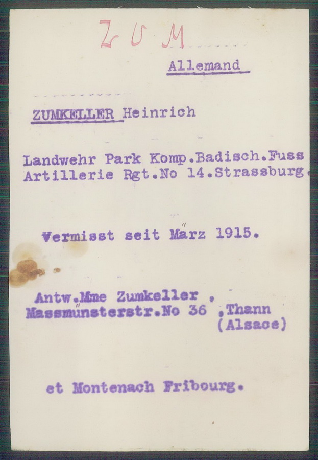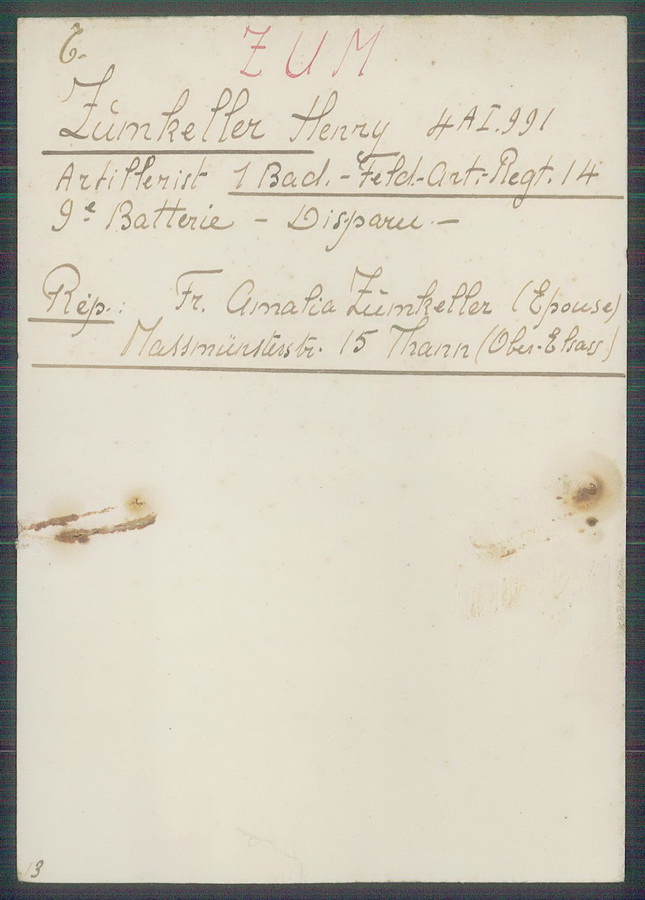 ZUMKELLER geboren in Thann/Elsass 1. Badisches Feld-Artillerie-Regiment 14, 9. Batterie, Landwehr Park Kompagnie aus Strassbourg Vermisst seit März 1915 |