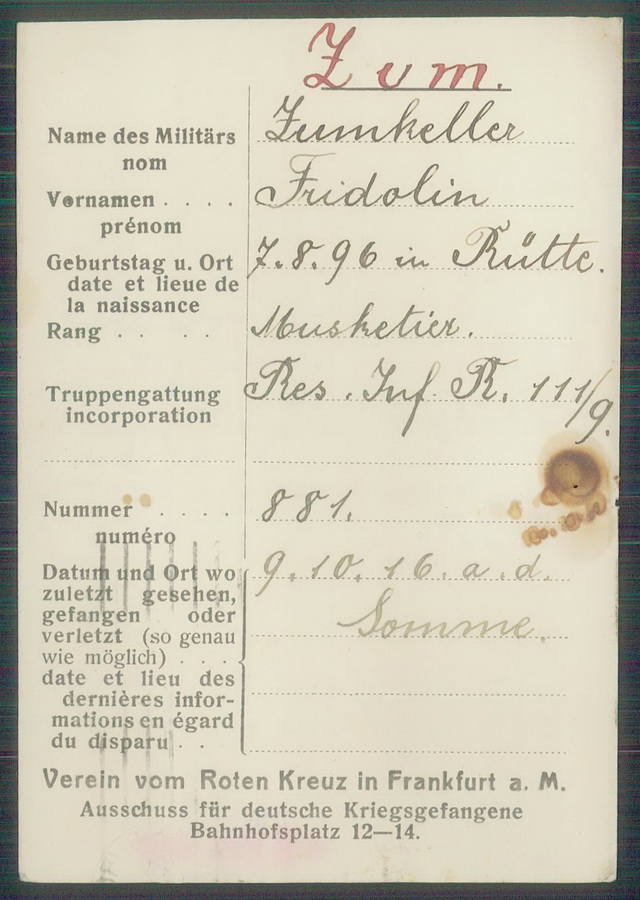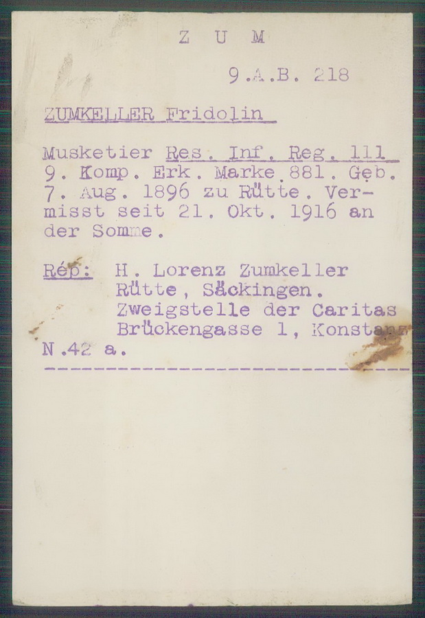 Musketier Fridolin ZUMKELLER geboren: 07.08.1896 in Rütte, Konstanz Reserve Infanterie Regiment 111, 9. Kompagnie Vermisst seit 21.10.1916 beim Gefecht an der Somme |
