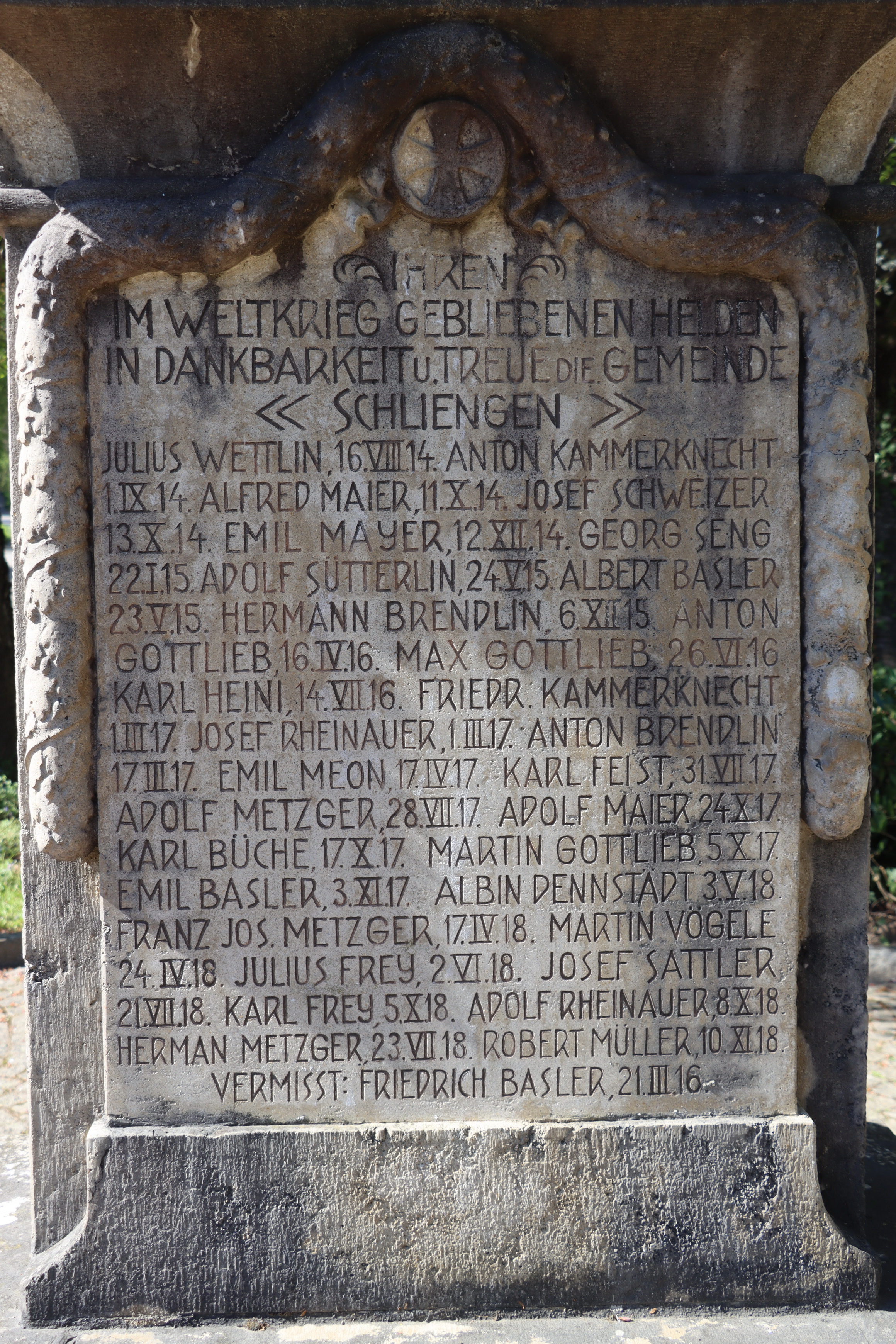 5 Personen aus Schliengen wurden während des NS-Regimes Opfer der Aktion T4 EUTHANASIE, ihre Namen stehen nicht auf dem Kriegerdenkmal, jedoch im Gedenkbuch der Tötungsanstalt in Grafeneck im ehemaligen Samariterstift des Schlosses Grafeneck.