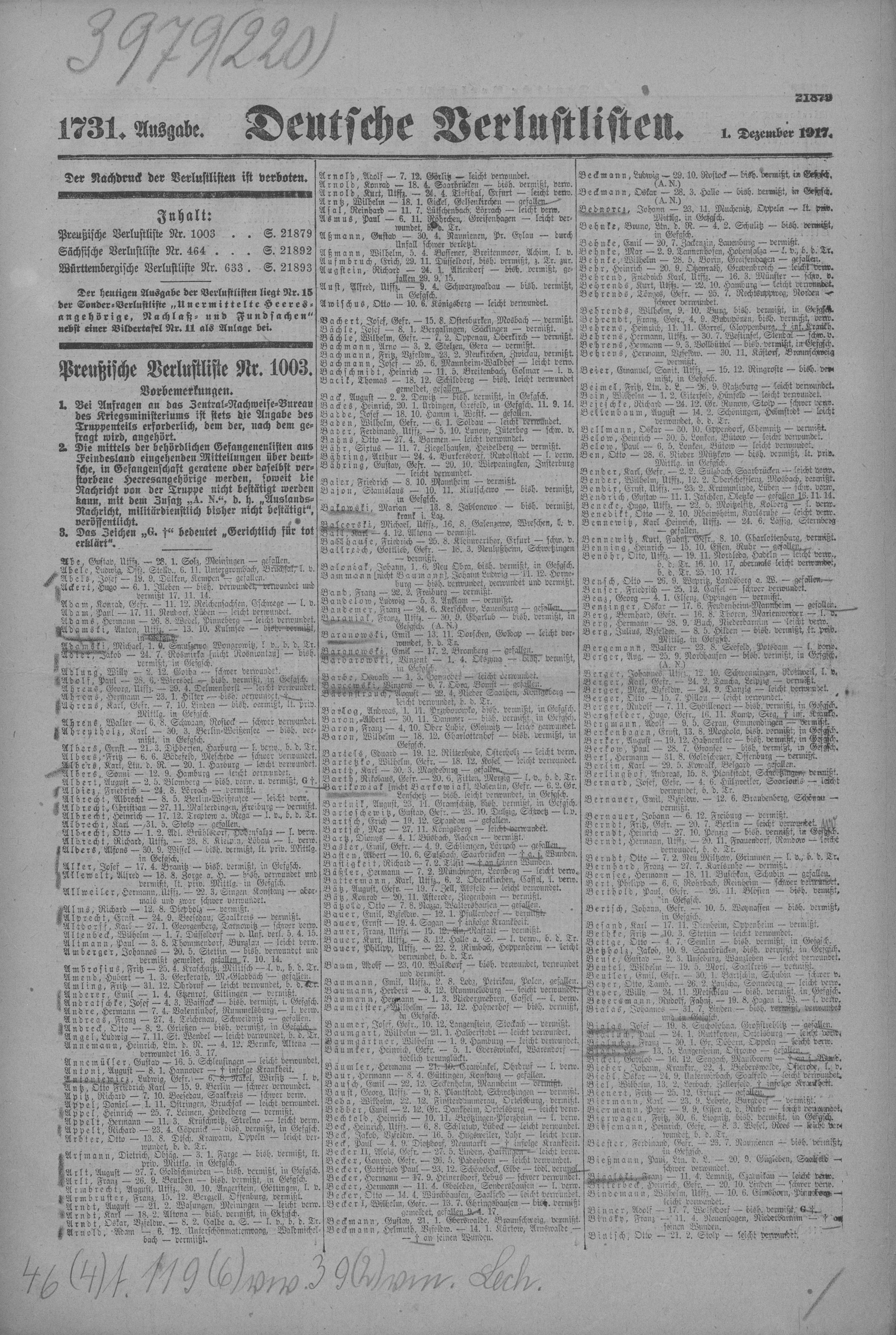 Sanitäter FEIST Karl Julius 12.09.1898 - 31.07.1917 Vermisst in Ypern (BE) |