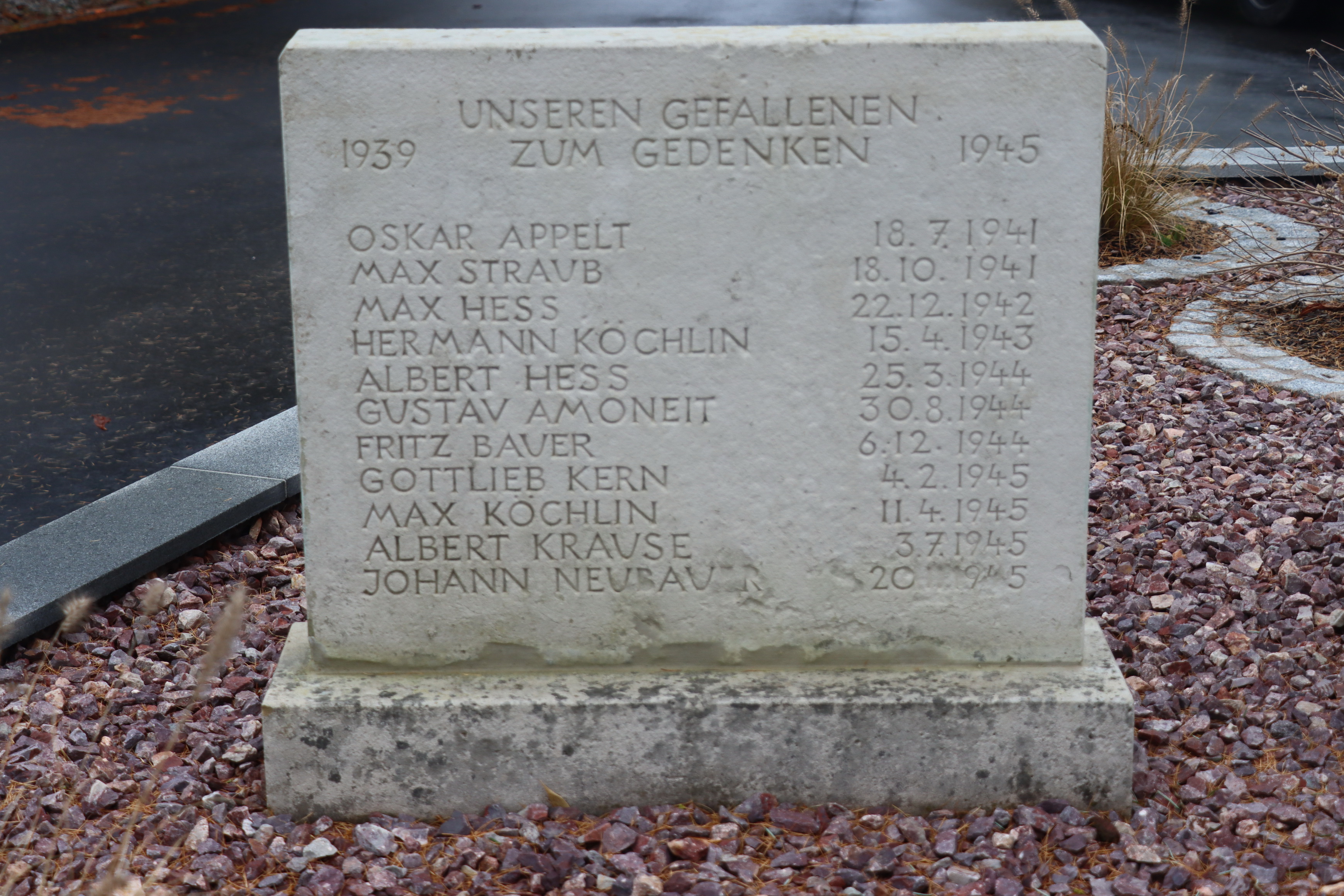 Herr KERN Gottlieb 31.12.1874 - 04.02.1945 ziviles Kriegsopfer Beim feindlichen Beschuss des Dorfes durch Granaten schwer verwundet, erlag seinen Wunden im Elisabethen Krankenhaus |