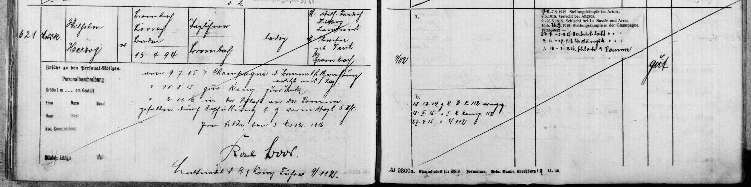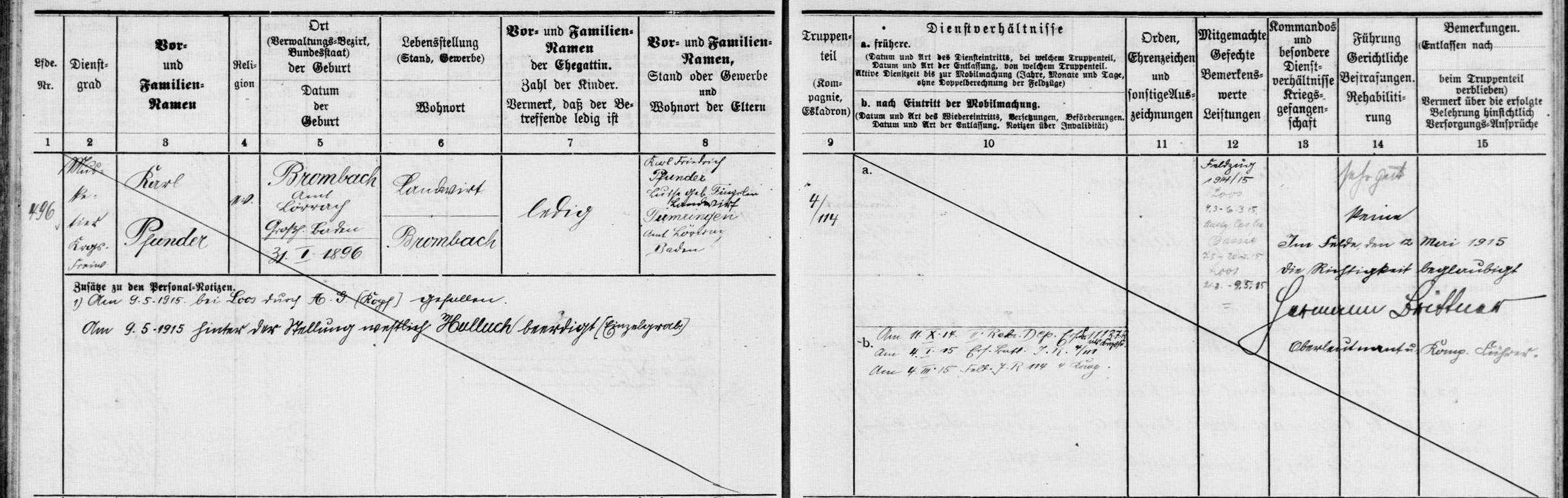 Kriegsfreiwilliger PFUNDER Karl Friedrich 31.01.1896 - 09.05.1915 19 Jahre alt aus Brombach 6. Badische Infanterie-Regiment Kaiser Friedrich III No.114 4. Kompagnie Gefallen in Loos (FR) *Enkel des Schwiegersohns des Ehemanns der Grosstante 6.Grades der Schwägerin der Ehefrau des Ur-Grossneffen des 2xUr-Grossonkel durch Heirat von Fabian Coulot |