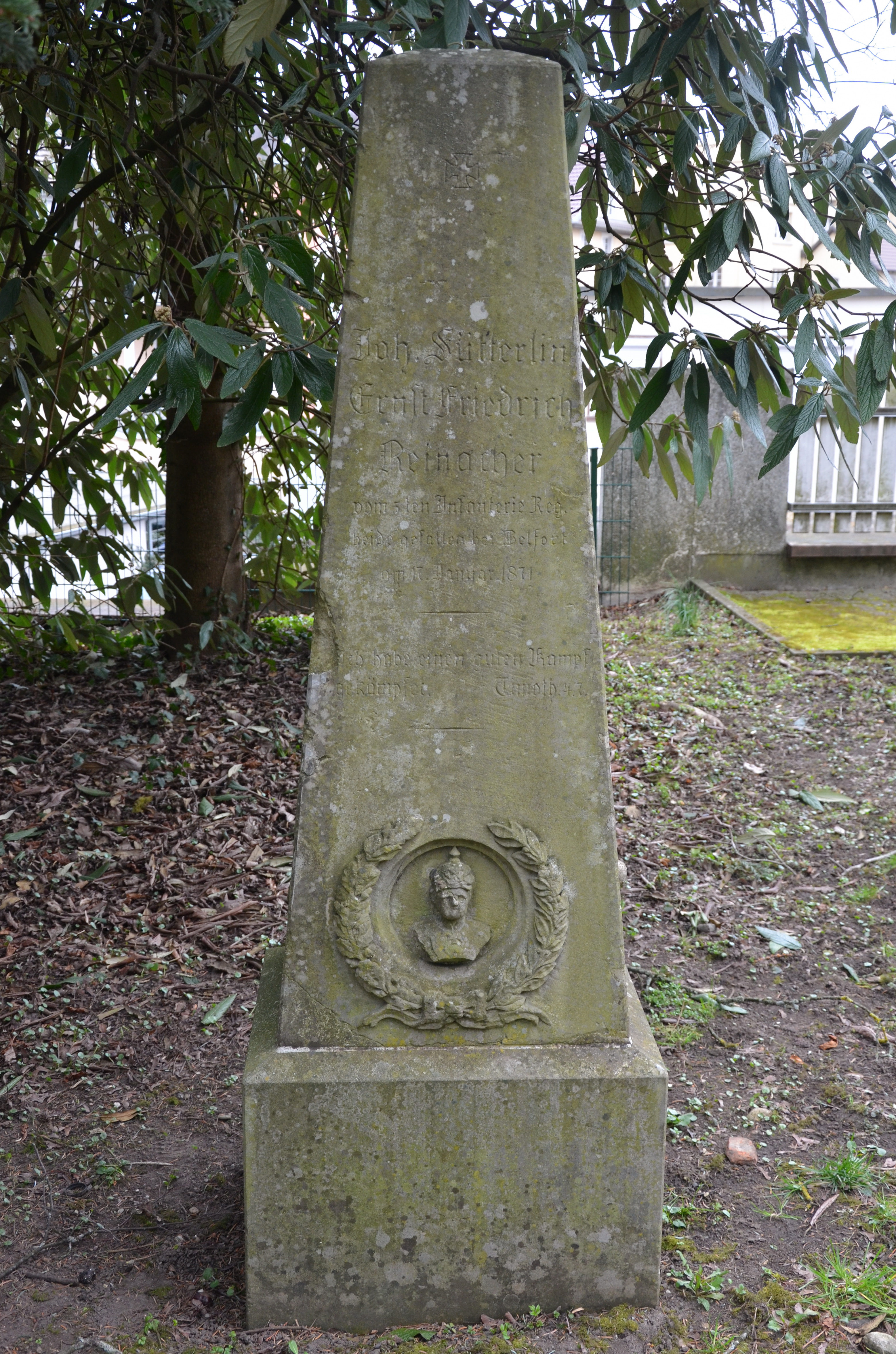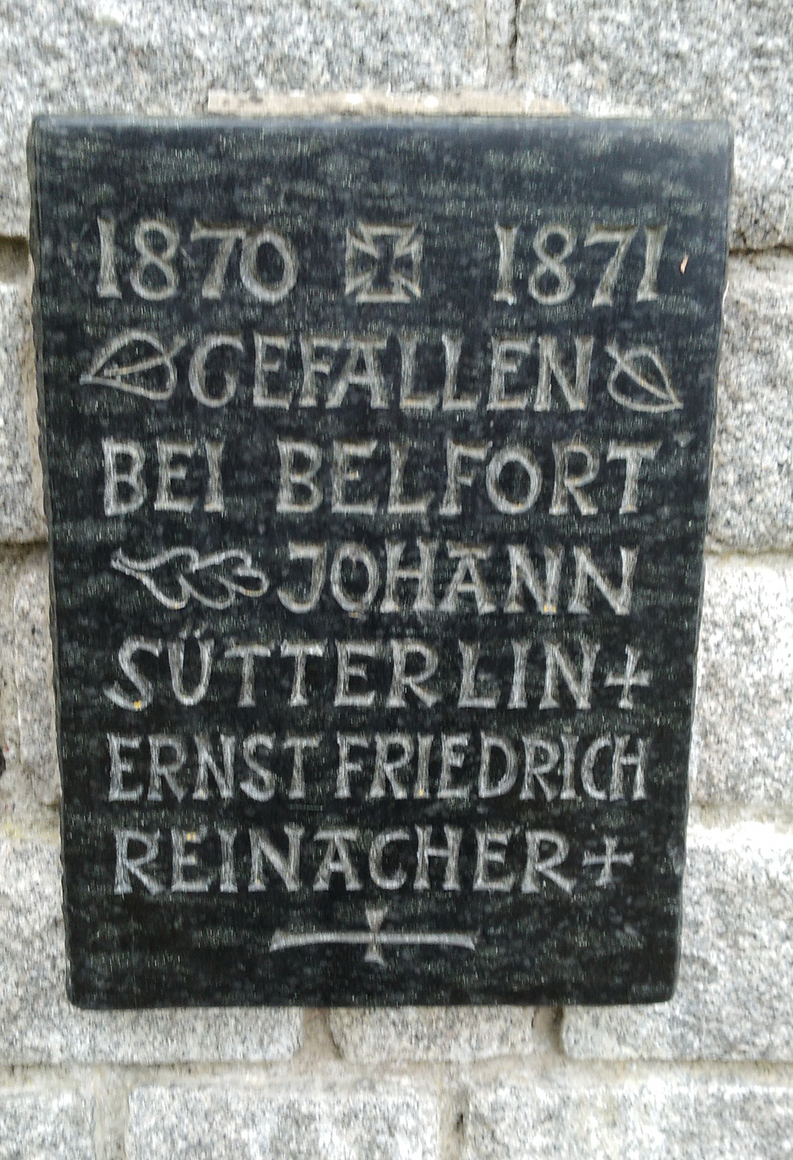 SÜTTERLIN Johannes 27.04.1849 - 17.01.1871 22 Jahre alt aus Brombach Grossherzoglich Badisches 5. Infanterie-Regiment Füsilier Bataillon, 10. Kompagnie Gilt als vermisst seit dem Gefecht in Chenebier (FR) |