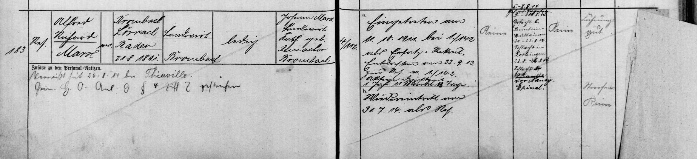 Reservist MARX Alfred Richard 21.08.1891 - 26.08.1914 23 Jahre alt aus Brombach 4. Badische Infanterie-Regiment Prinz Wilhelm No.112 4. Kompagnie Gilt als vermisst im Raum Thiaville (FR) *Neffe der Ehefrau des Grossonkel 3.Grades der Grosstante durch Heirat von Fabian Coulot |