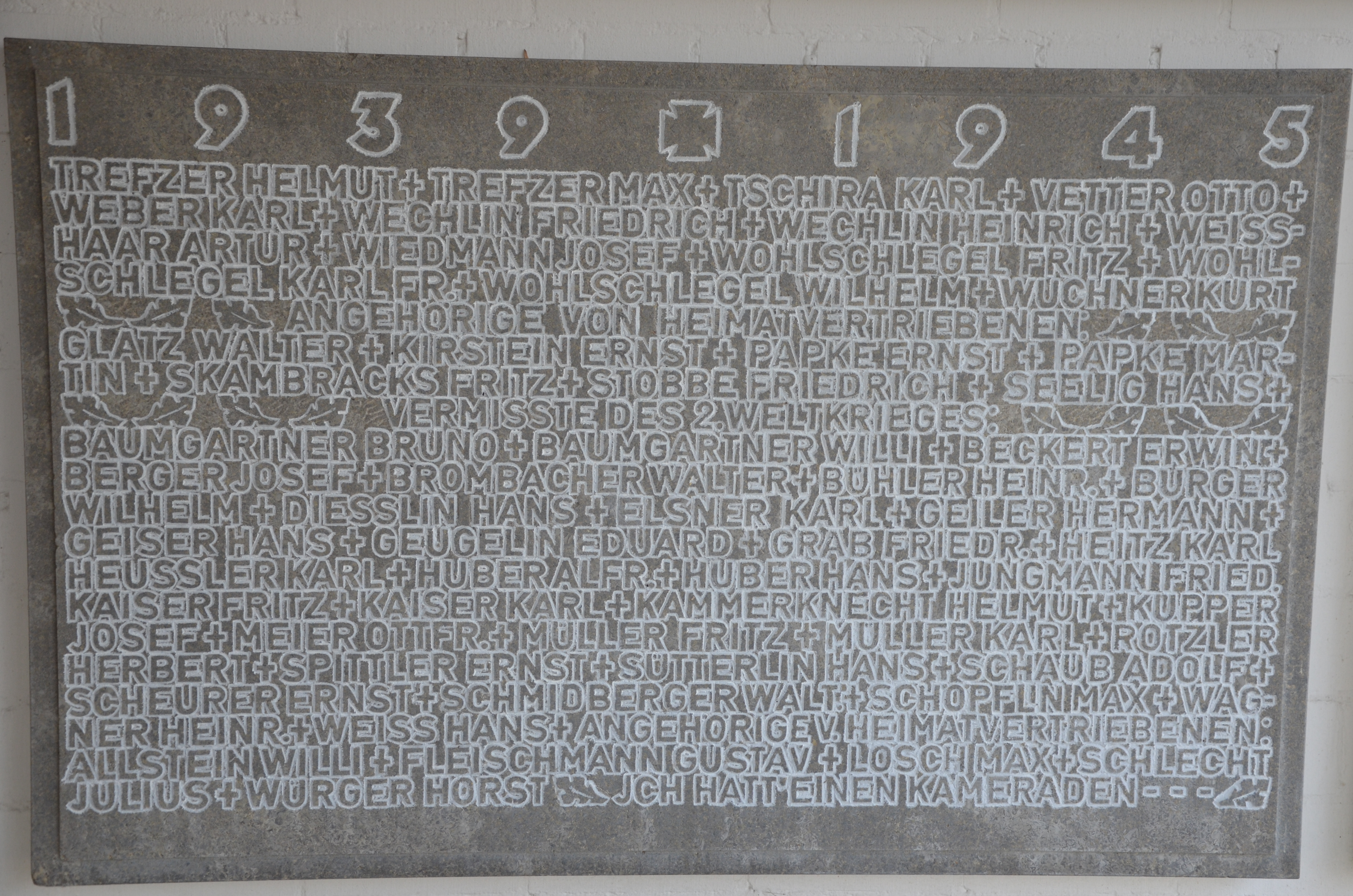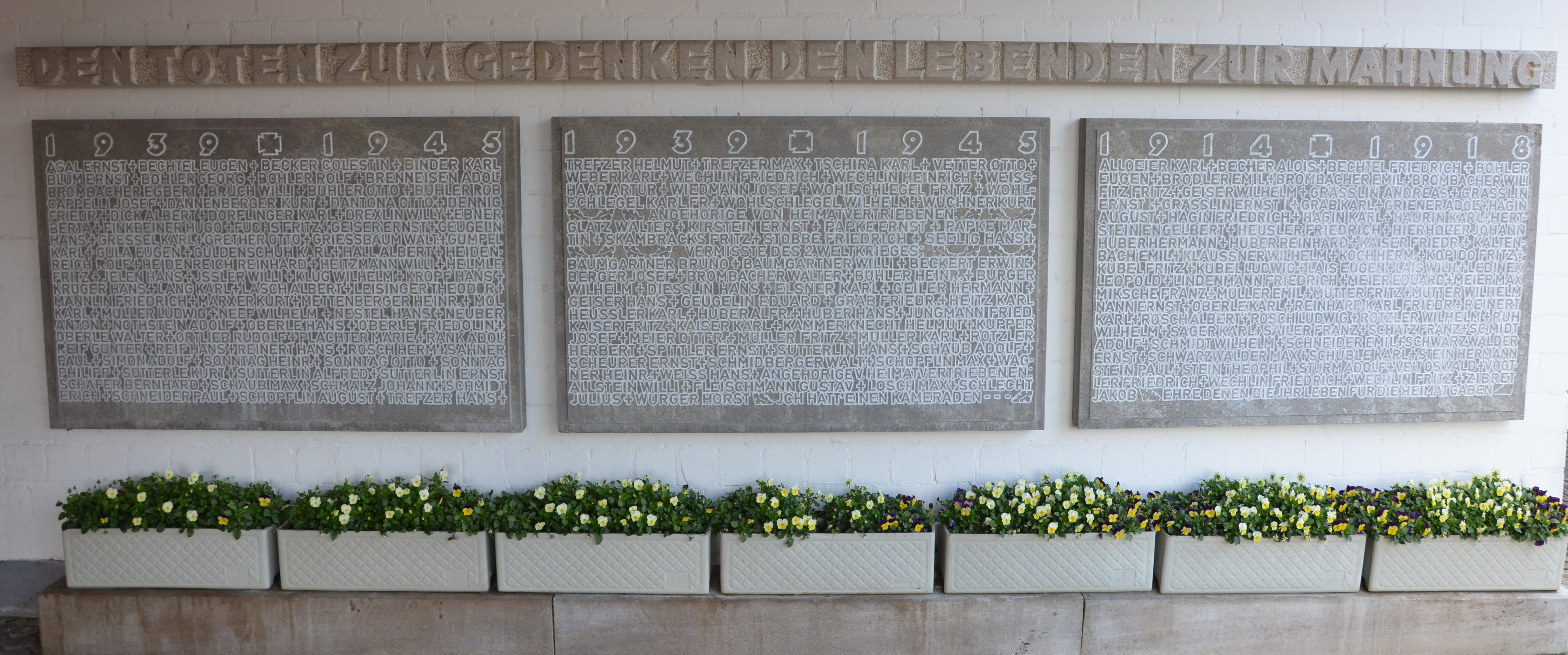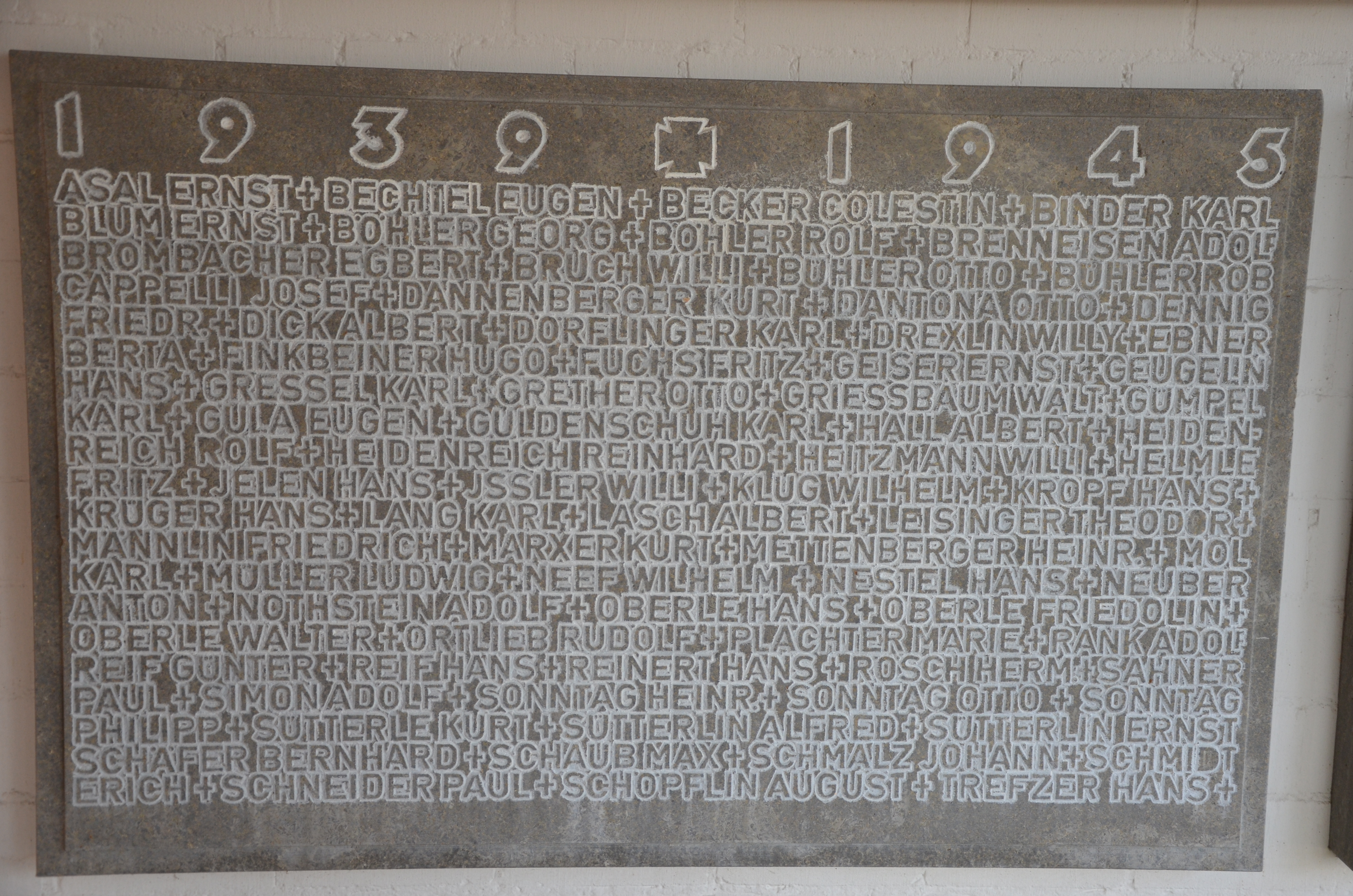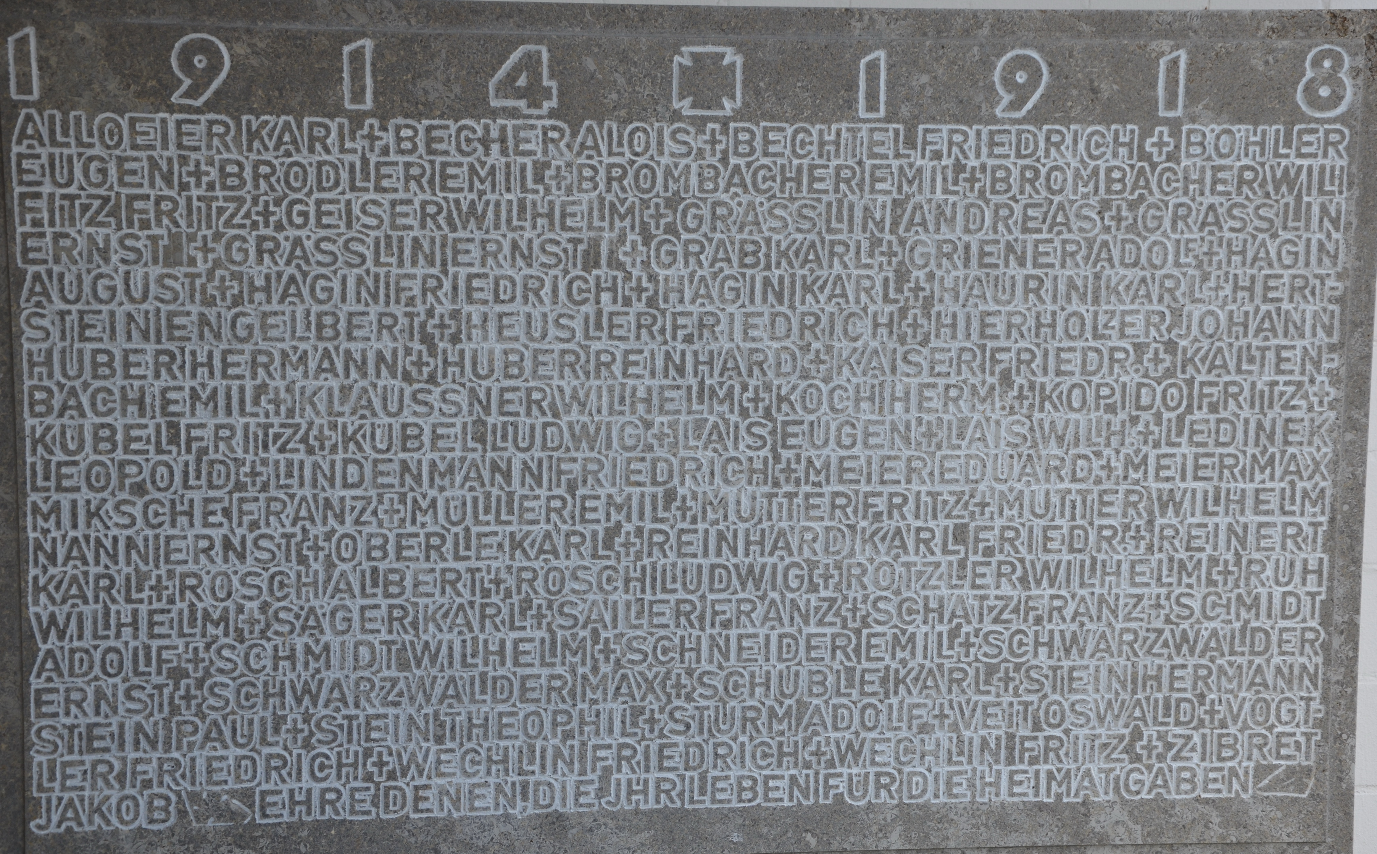 Von den 66 Gefallenen aus dem 1. Weltkrieg (1914-1918) aus Haagen sind 12 mit Fabian Coulot verwandt, dessen Gedenkplatten an der Aussenwand der Abdankungshalle auf dem Friedhof Lörrach-Haagen zu finden sind. | Das Ortsfamilienbuch Haagen wurde nur bis ins Jahr 1905 erfasst, so sind die Opfer des 2.Weltkriegs leider nicht übertragbbar. |