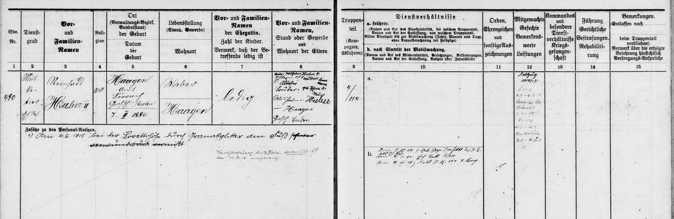Musketier HUBER Reinhard 07.02.1886 - 04.06.1915 29 Jahre alt aus Haagen 6. Badische Infanterie-Regiment Kaiser Friedrich III No.114 4. Kompagnie Gefallen Lorettohöhe (FR) 2xUr-Grossneffe des Ehemanns der Tante 3.Grades des Ehemanns der Nichte 2.Grades der 2xUr-Grosstante durch Heirat der Schwägerin der Ehefrau des Ur-Grossneffen des 2xUr-Grossonkel durch Heirat von Fabian Coulot |
