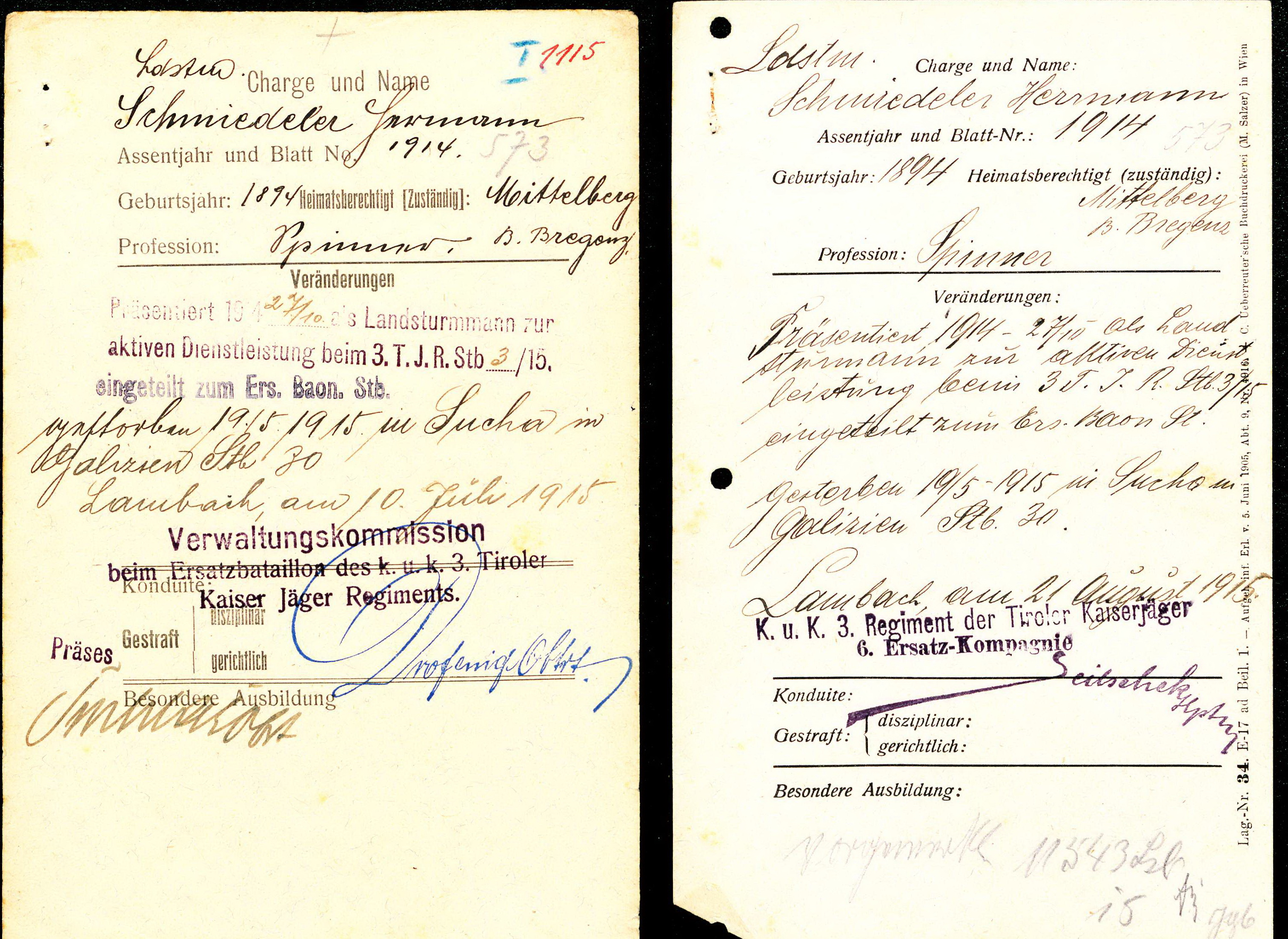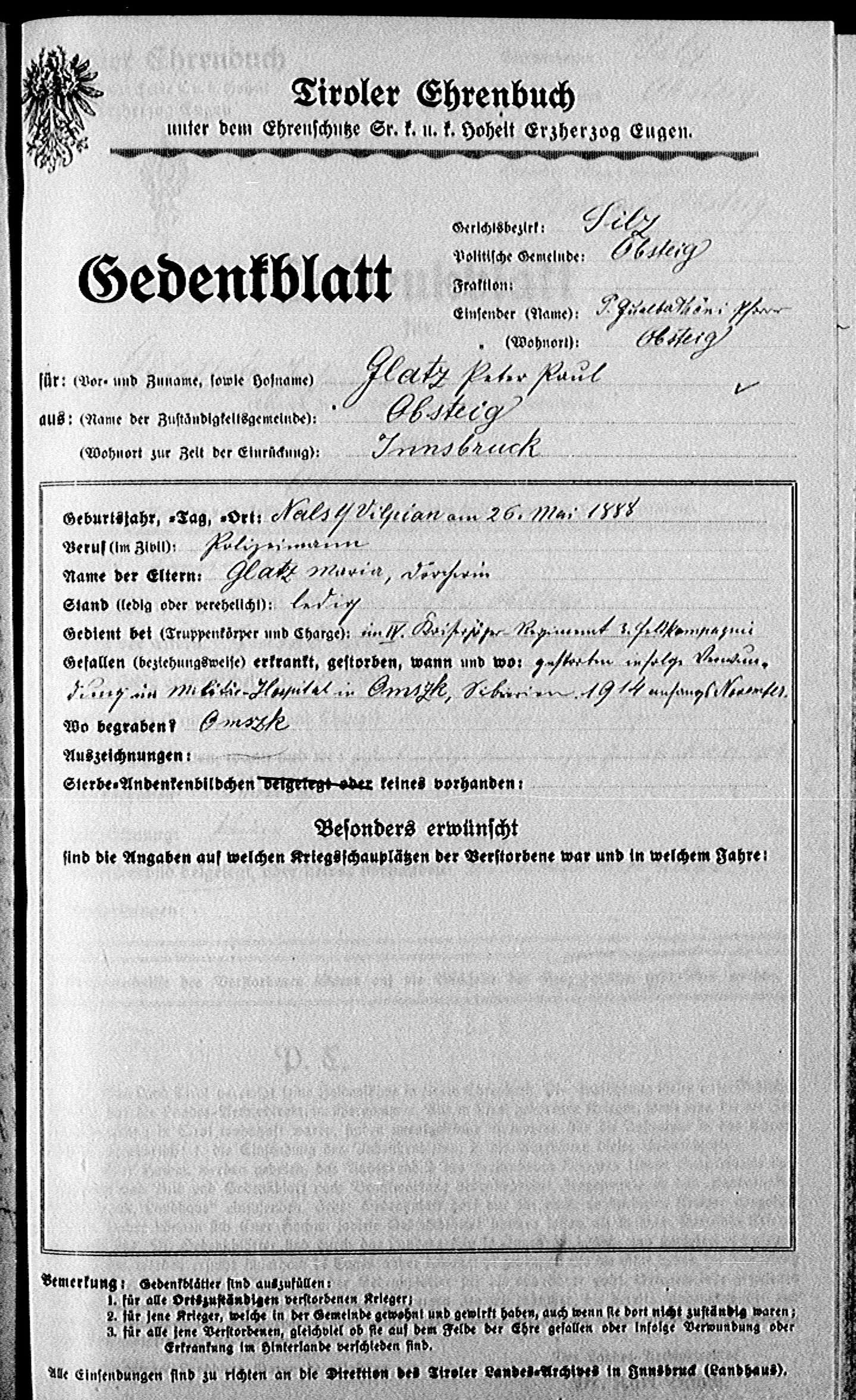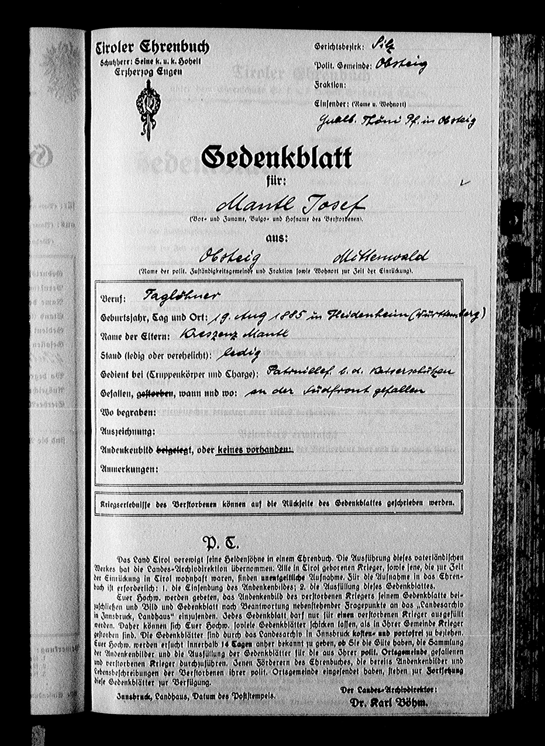 MANTL (05.10.1865 - 22.12.1924) aus A-Obsteig + Maria BETZ 09.01.1876 - 26.04.1966 hatten 7 gemeinsame Kinder. 2 Töchter und 5 Söhne. Alle 5 Söhne sind während den beiden Weltkriegen gefallen. |