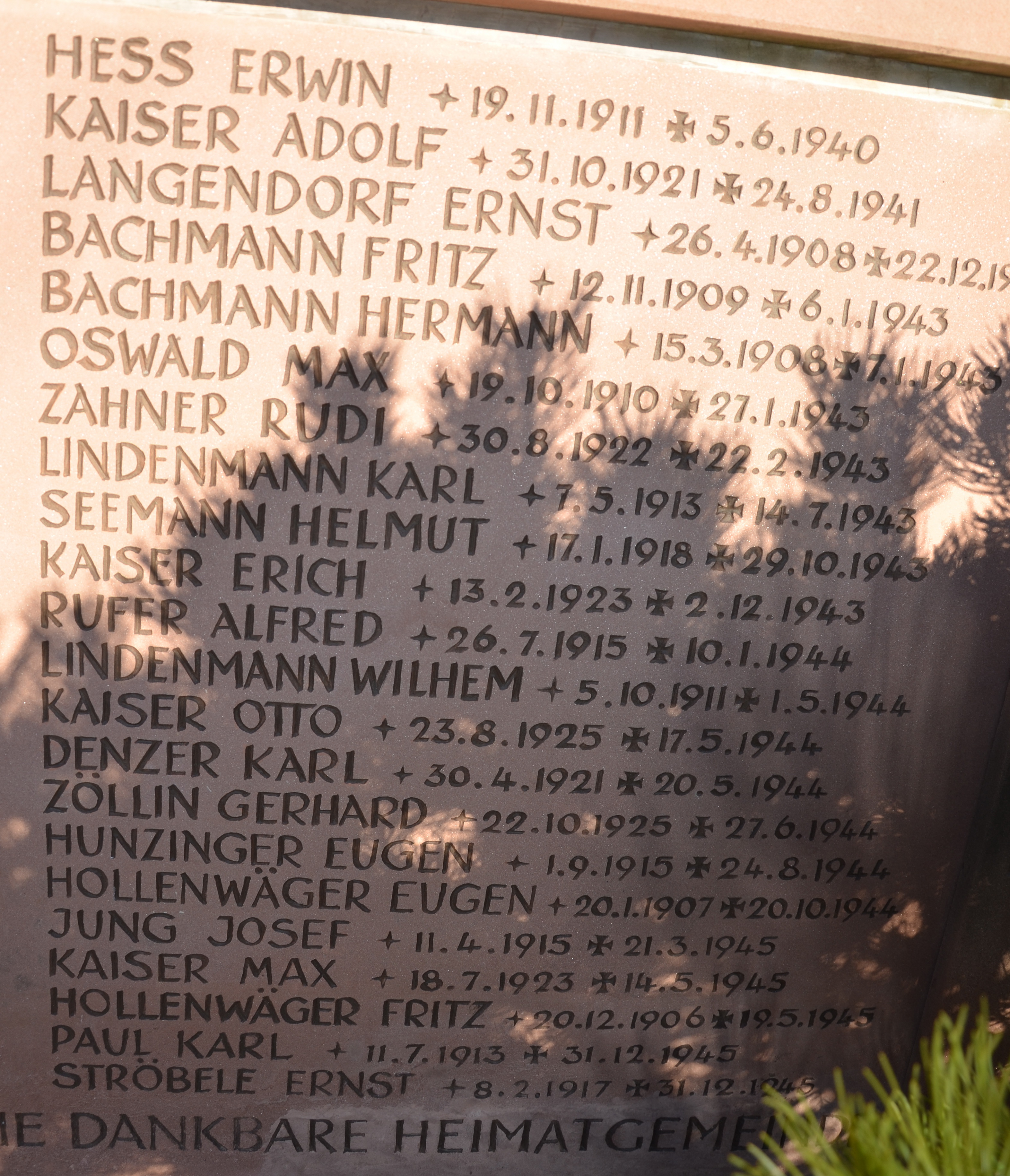 Von den 18 Namen der Gefallenen aus dem 1. Weltkrieg (1914-1918) auf dem Denkmal an der Kirchenwand in Niedereggenen sind 11 Soldaten mit Fabian Coulot verwandt | Von den 22 Namen der Gefallenen aus dem 2. Weltkrieg (1939-1945) auf dem Denkmal an der Kirchenwand in Niedereggenen sind 18 Soldaten mit Fabian Coulot verwandt |