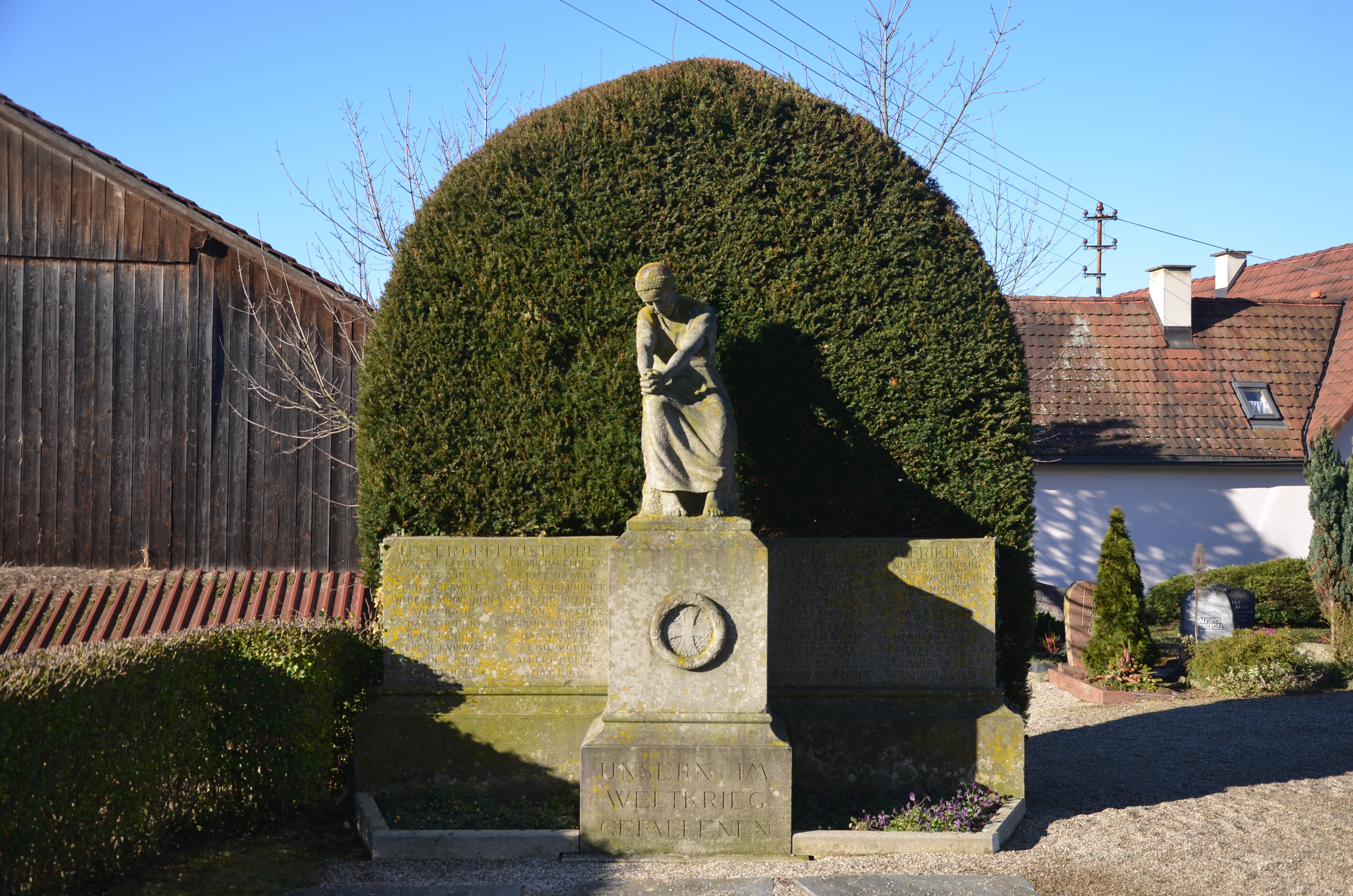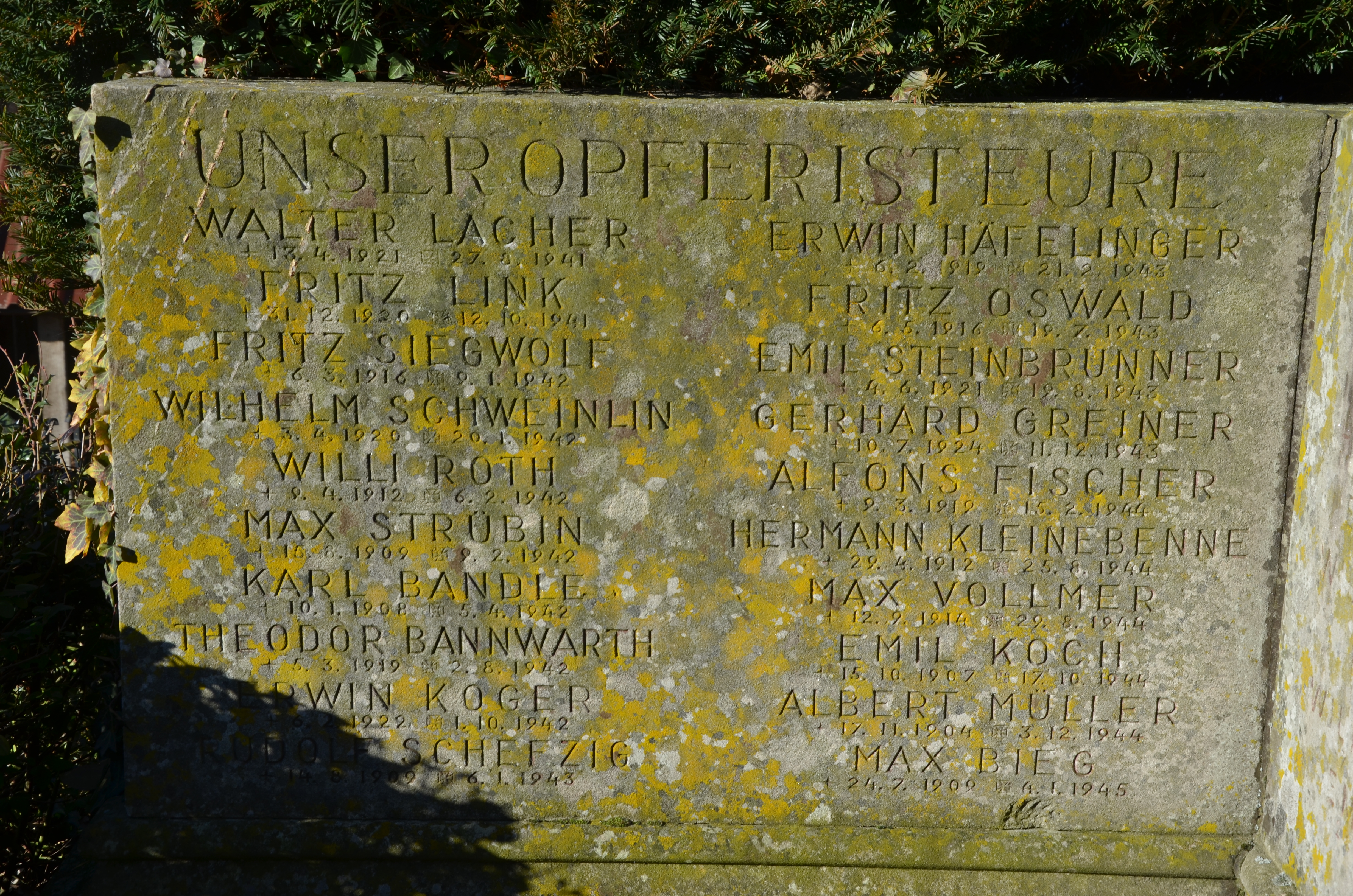 Von den 17 Namen der Gefallenen aus dem 1. Weltkrieg (1914-1918) auf dem Kriegerdenkmal im Friedhof bei der Evangelischen Kirche in Obereggenen sind 12 Soldaten davon mit Fabian Coulot verwandt. | Von den 39 Namen der Gefallenen aus dem 2.Weltkrieg (1939-1945) auf dem Kriegerdenkmal im Friedhof bei der Evangelischen Kirche in Obereggenen sind 20 Soldaten davon mit Fabian Coulot verwandt. |