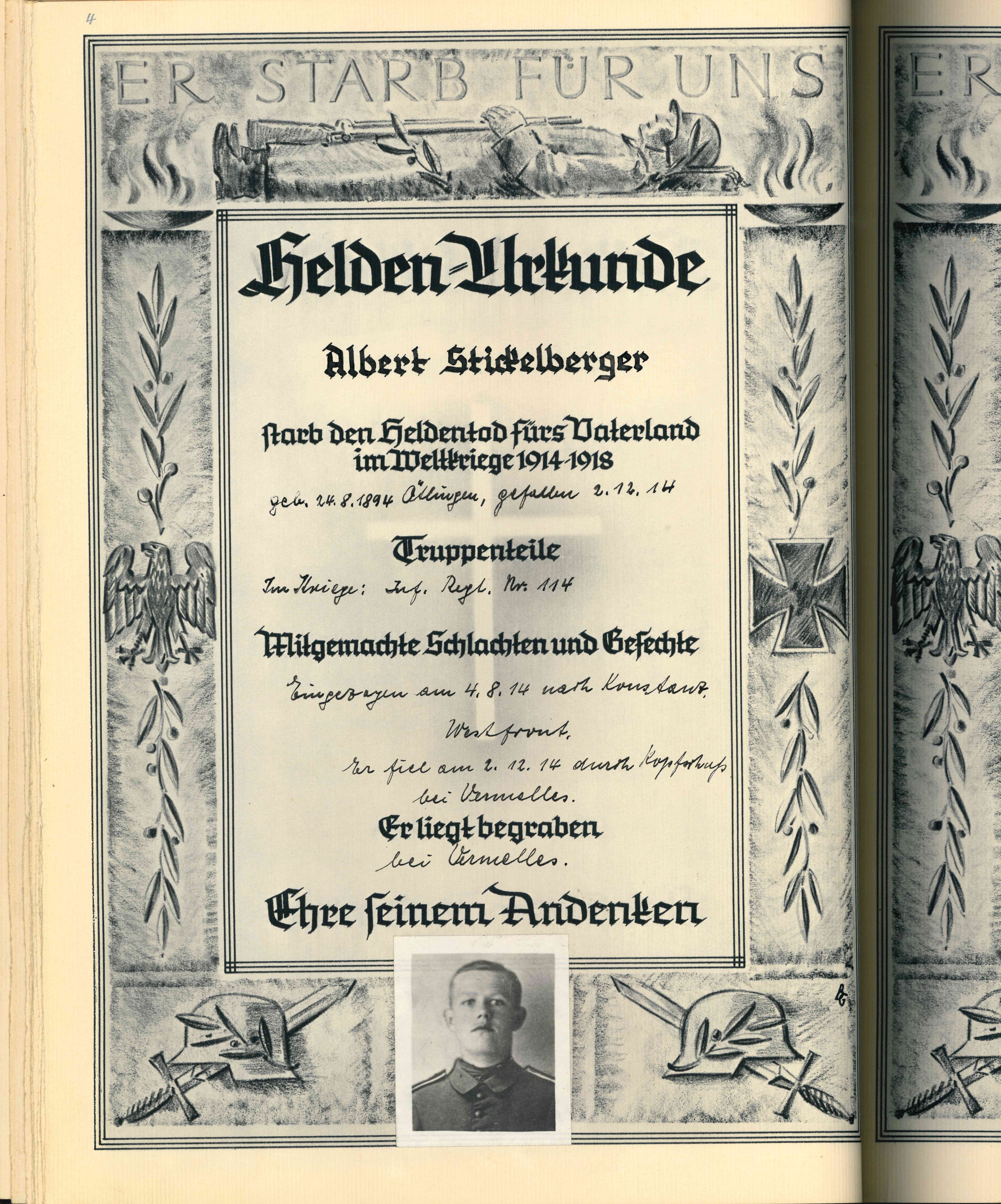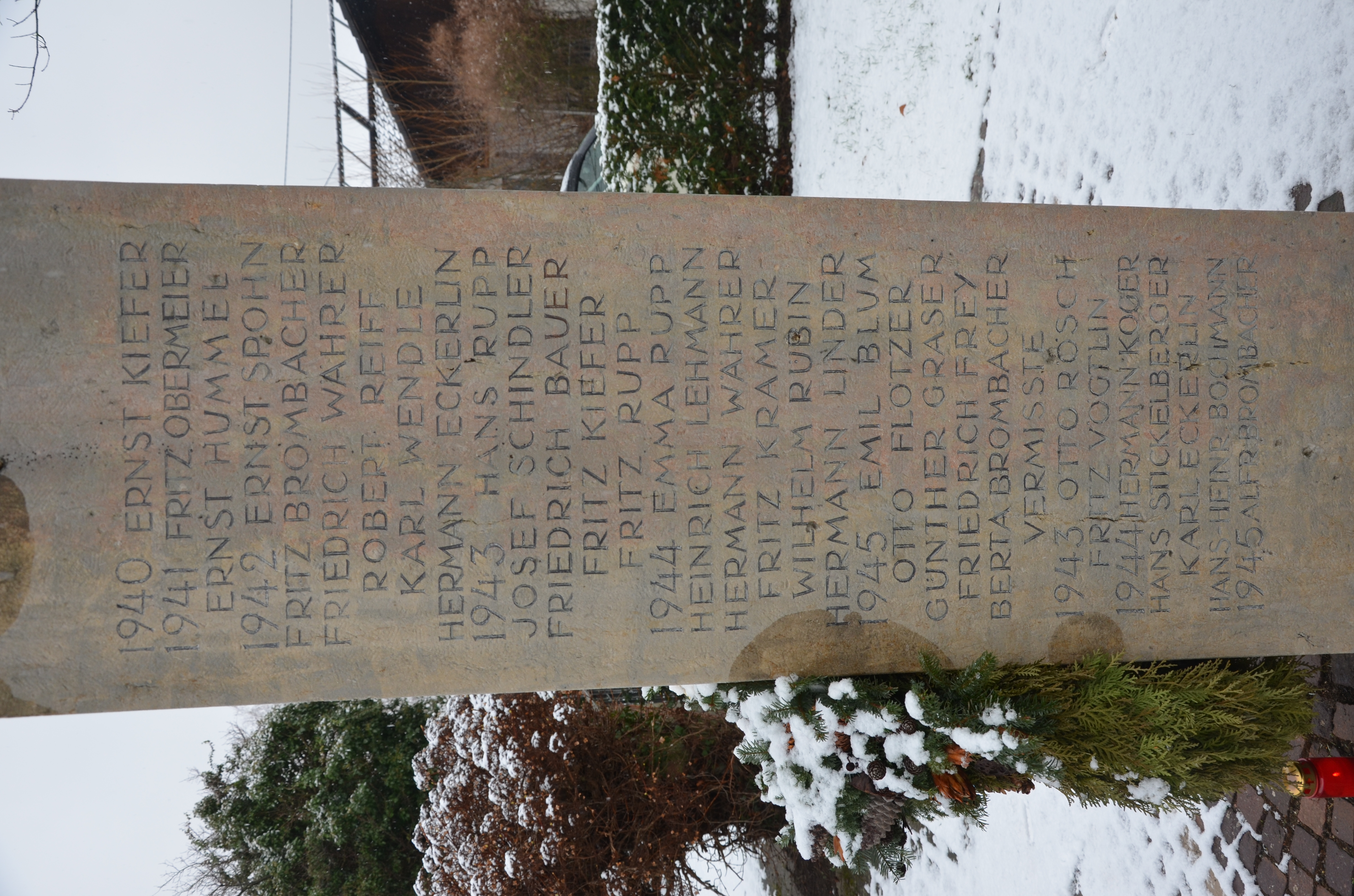 Obergefreiter LEHMANN Heinrich Josef 07.08.1918 - 21.01.1944 26 Jahre alt aus Ötlingen Verstorben auf dem Hauptverbandsplatz in Mastelo-Nikolikoje (RUS) Name verzeichnet auch auf Denkmal in Mönchweiler |