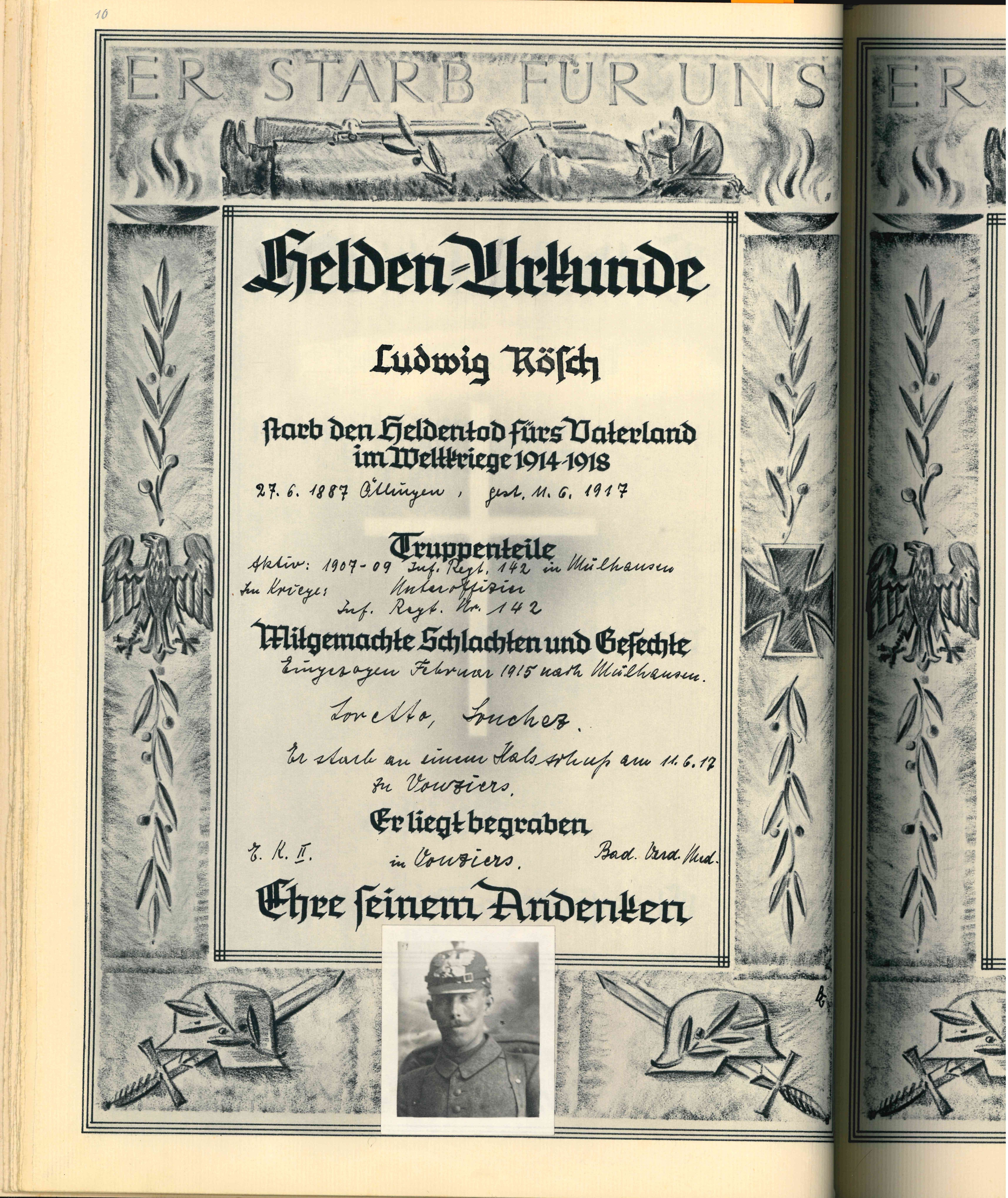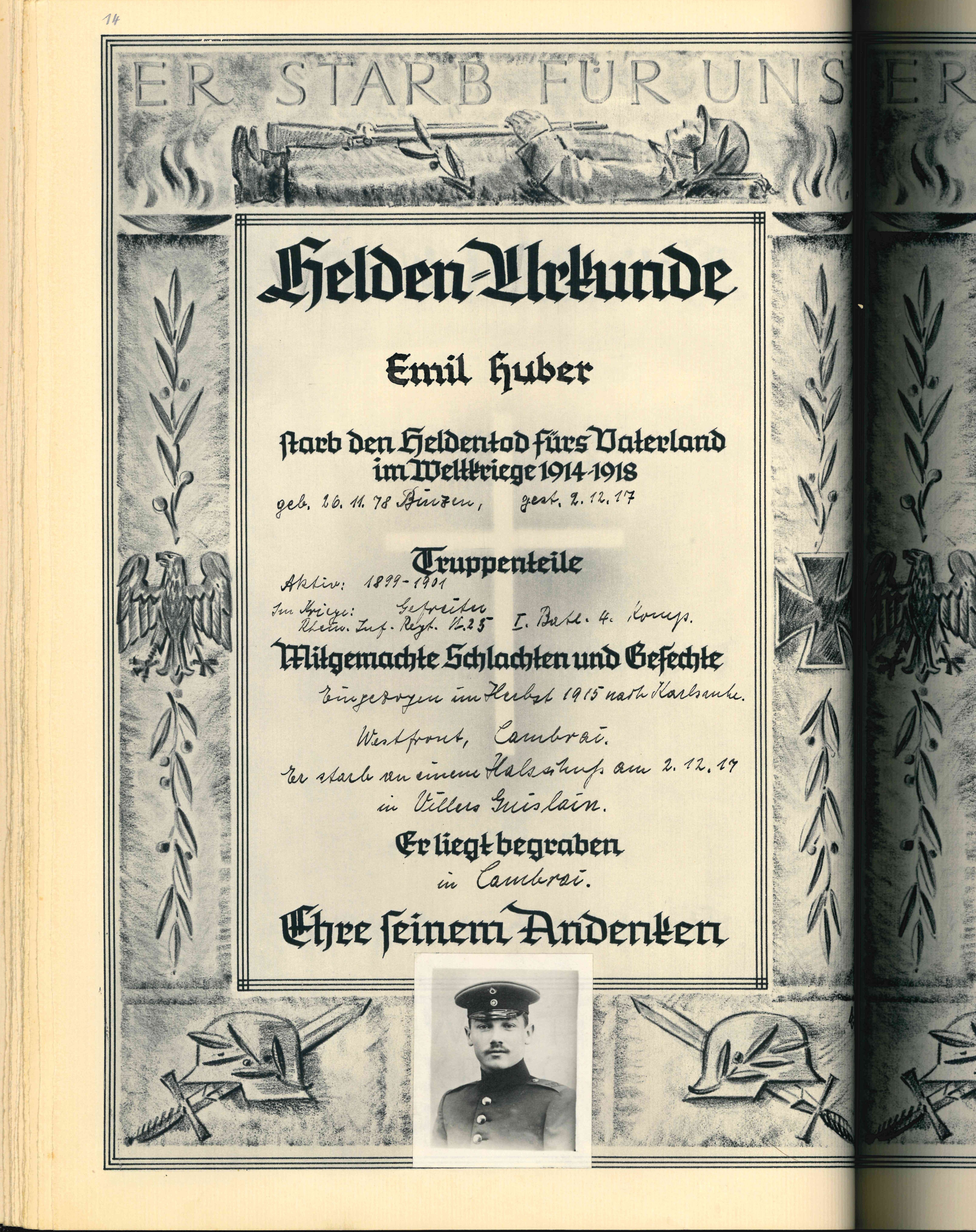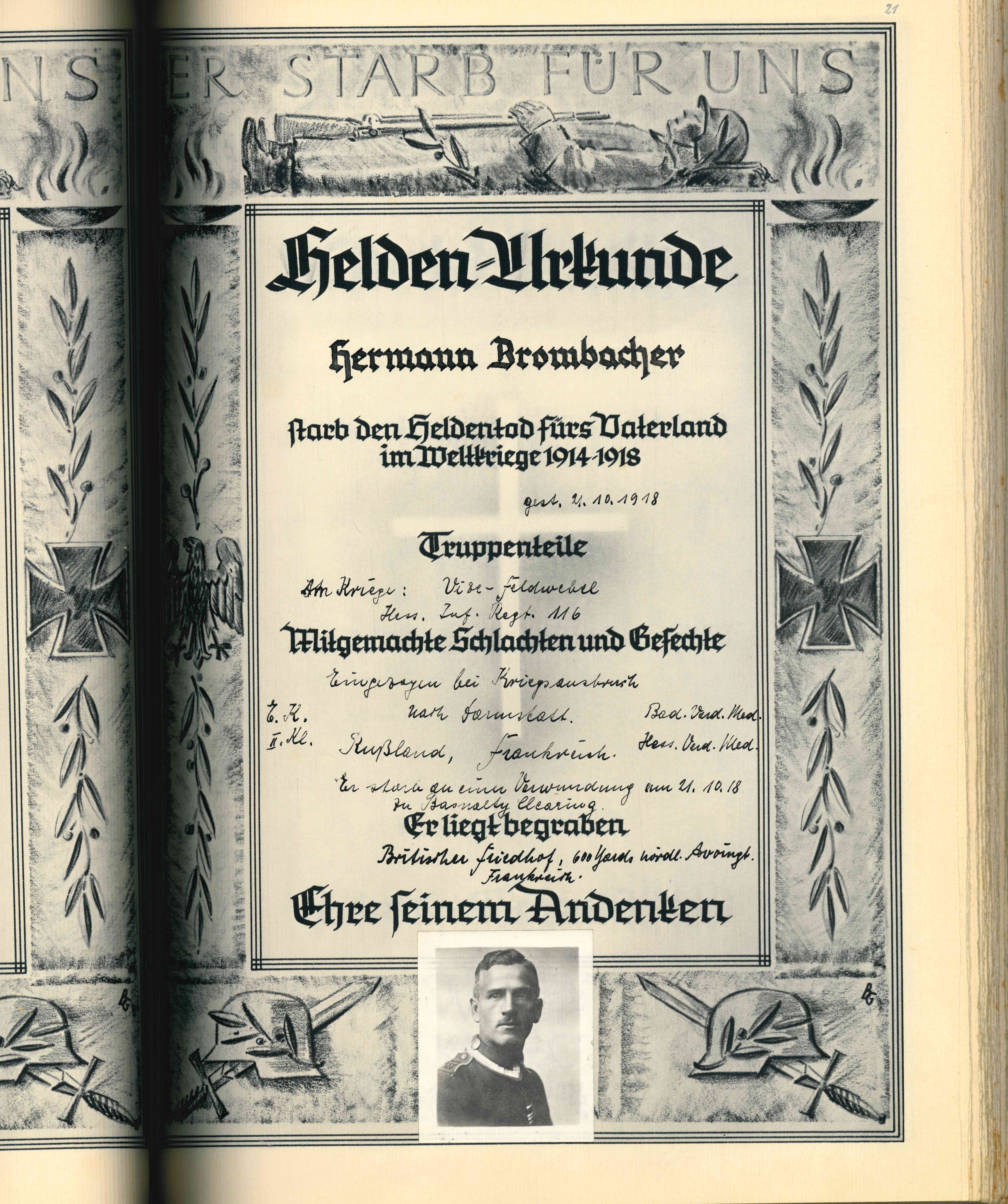 Krankenträger BROMBACHER Friedrich Karl 05.04.1897 - 11.10.1917 20 Jahre alt aus Ötlingen 4. Badische Infanterie Regiment Prinz Wilhelm No. 112 11. Kompagnie Verstorben im Feldlazarett 263 in Peuvillers (F) - Verdun Kriegsgräberstätte Lissey (F) Grab 738 |