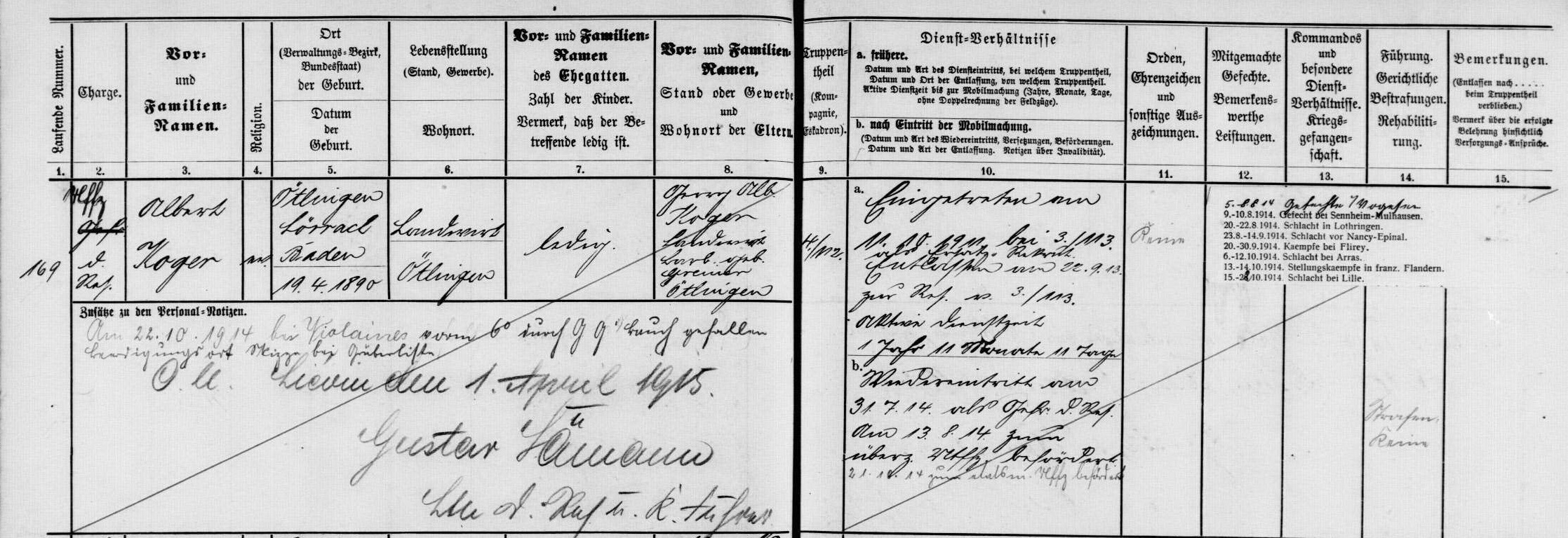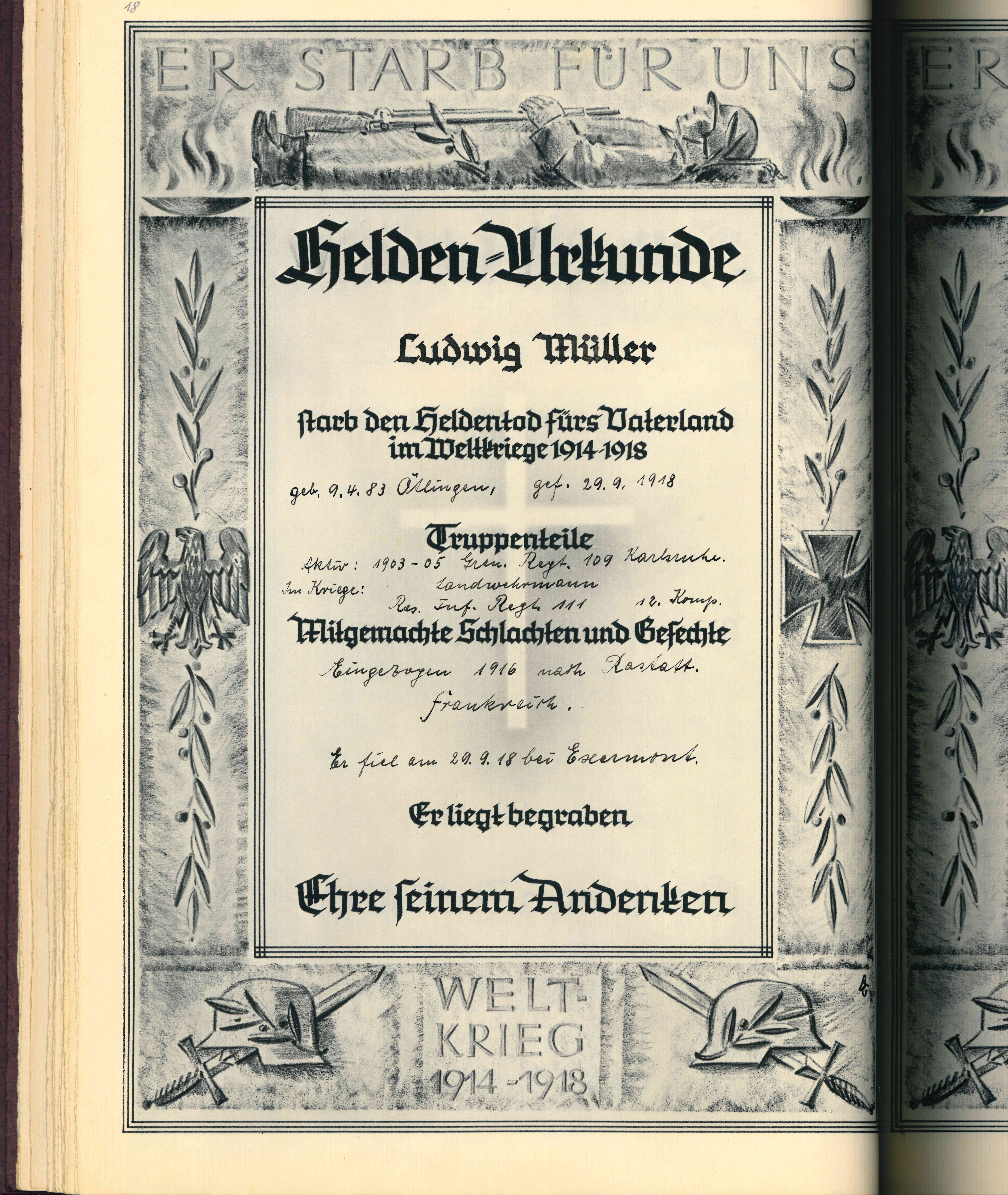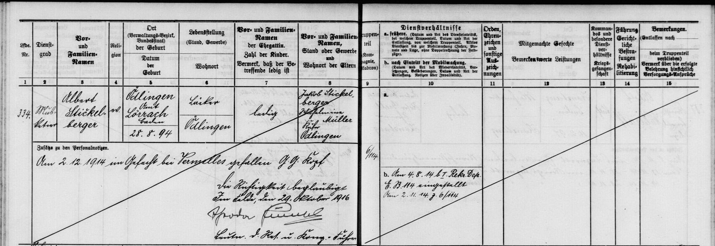 Krankenträger BROMBACHER Friedrich Karl 05.04.1897 - 11.10.1917 20 Jahre alt aus Ötlingen 4. Badische Infanterie Regiment Prinz Wilhelm No. 112 11. Kompagnie Verstorben im Feldlazarett 263 in Peuvillers (F) - Verdun Kriegsgräberstätte Lissey (F) Grab 738 |