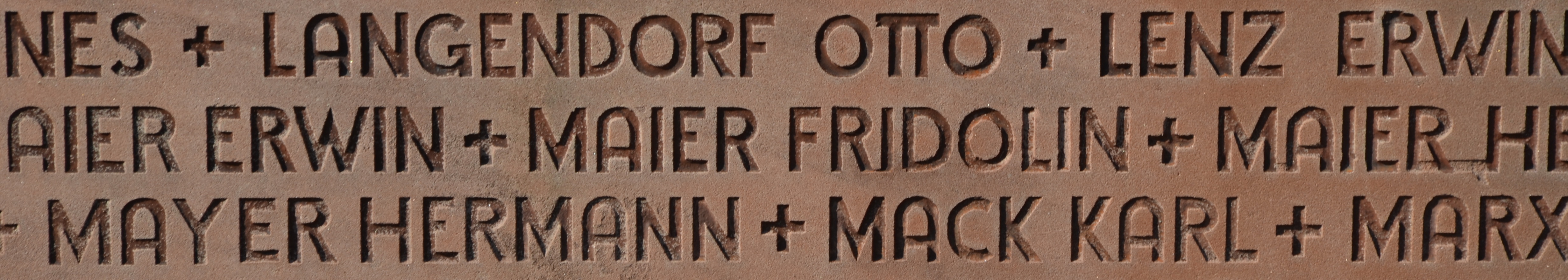 Gefreiter Fridolin MAIER 08.01.1909 - 1946 37 Jahre alt aus Riedichen i.W. Verstorben in russischer Gefangenschaft im Lager 134/6 in Nikolei-Jewka Sein Name befindet sich im Gedenkbuch des Sammelfriedhofes in Kiew Denkmal in Zell im Wiesental |