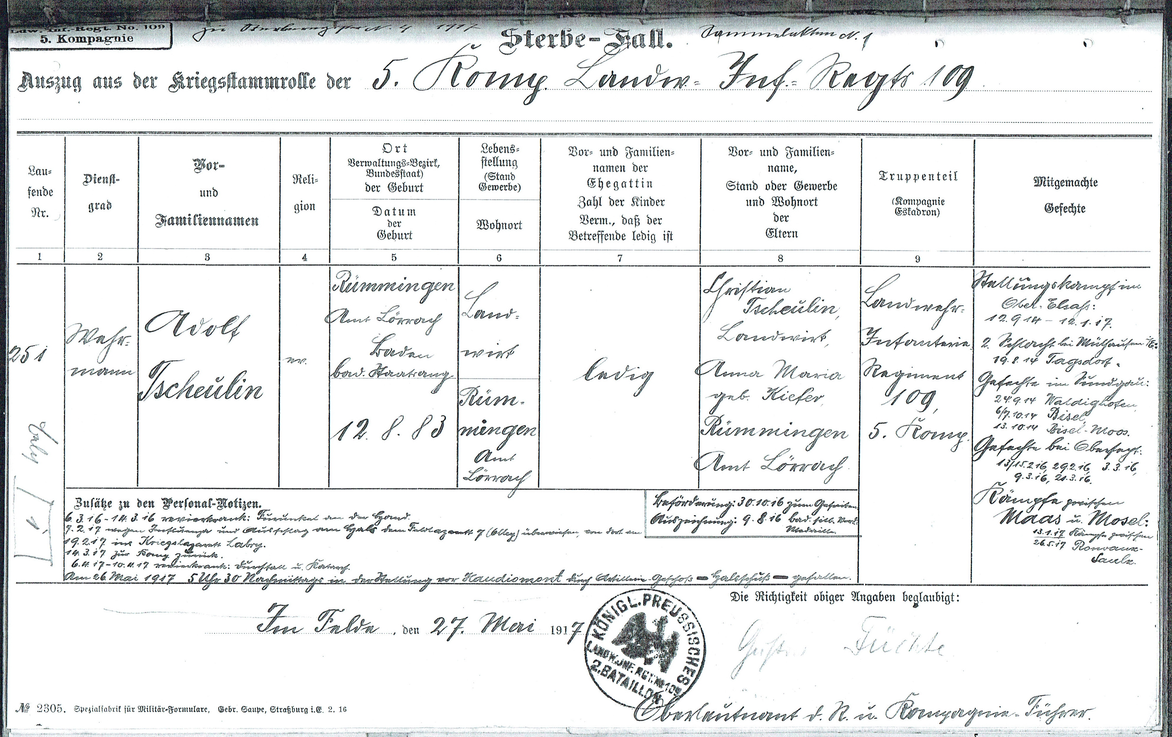 ASAL Friedrich 03.06.1898 - 22.09.1918 20 Jahre alt aus Rümmingen Maschinengewehr Scharfschützen Abteilung No. 24 1. Kompagnie Gefallen in Maubeuge *Bruder von Karl Ludwid Asal |