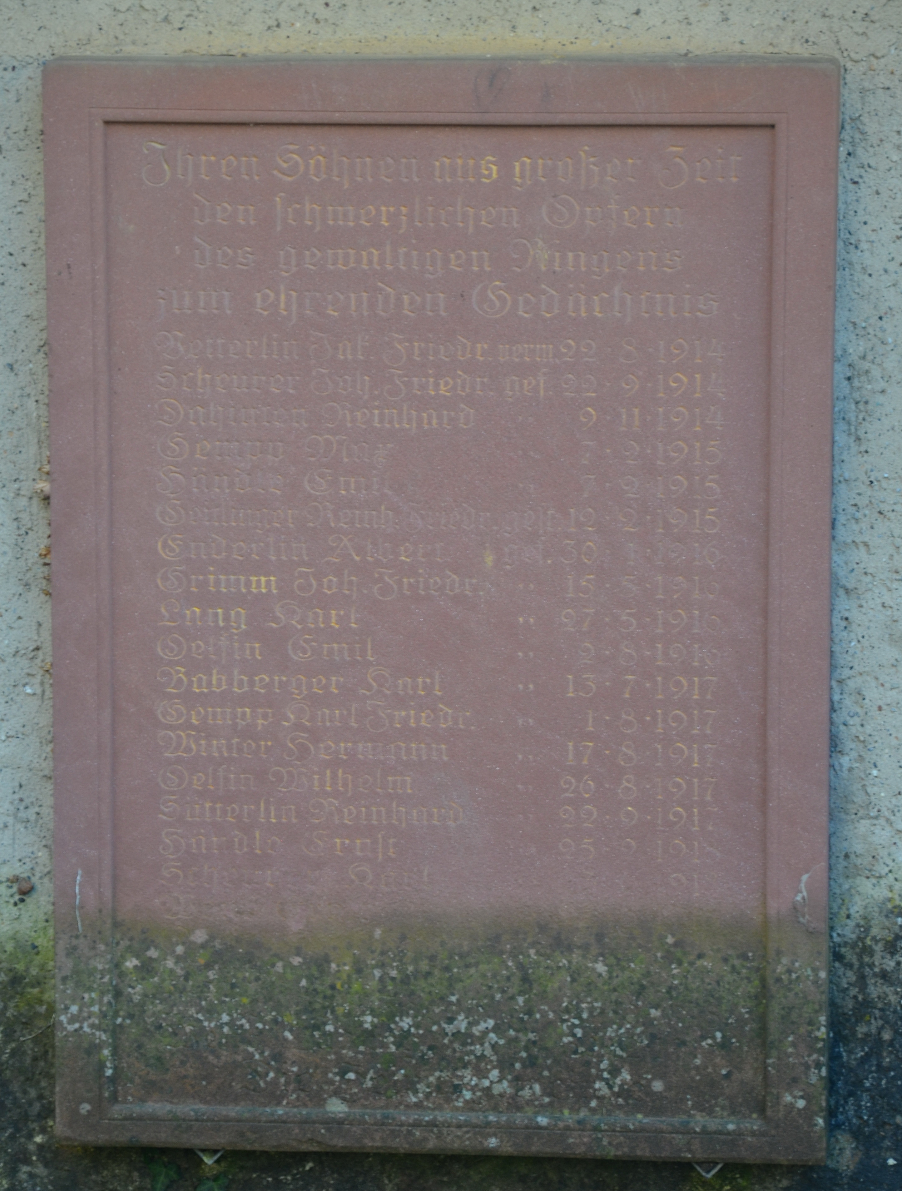 Ersatz-Reservist ÖLFIN Wilhelm Friedrich 11.01.1890 - 26.08.1917 27 Jahre alt aus Schallbach Gefallen in Ornes bei Verdun (FR) Kriegsgräberstätte in Merles-sur-Loison (FR) Block 1, Grab 208 |