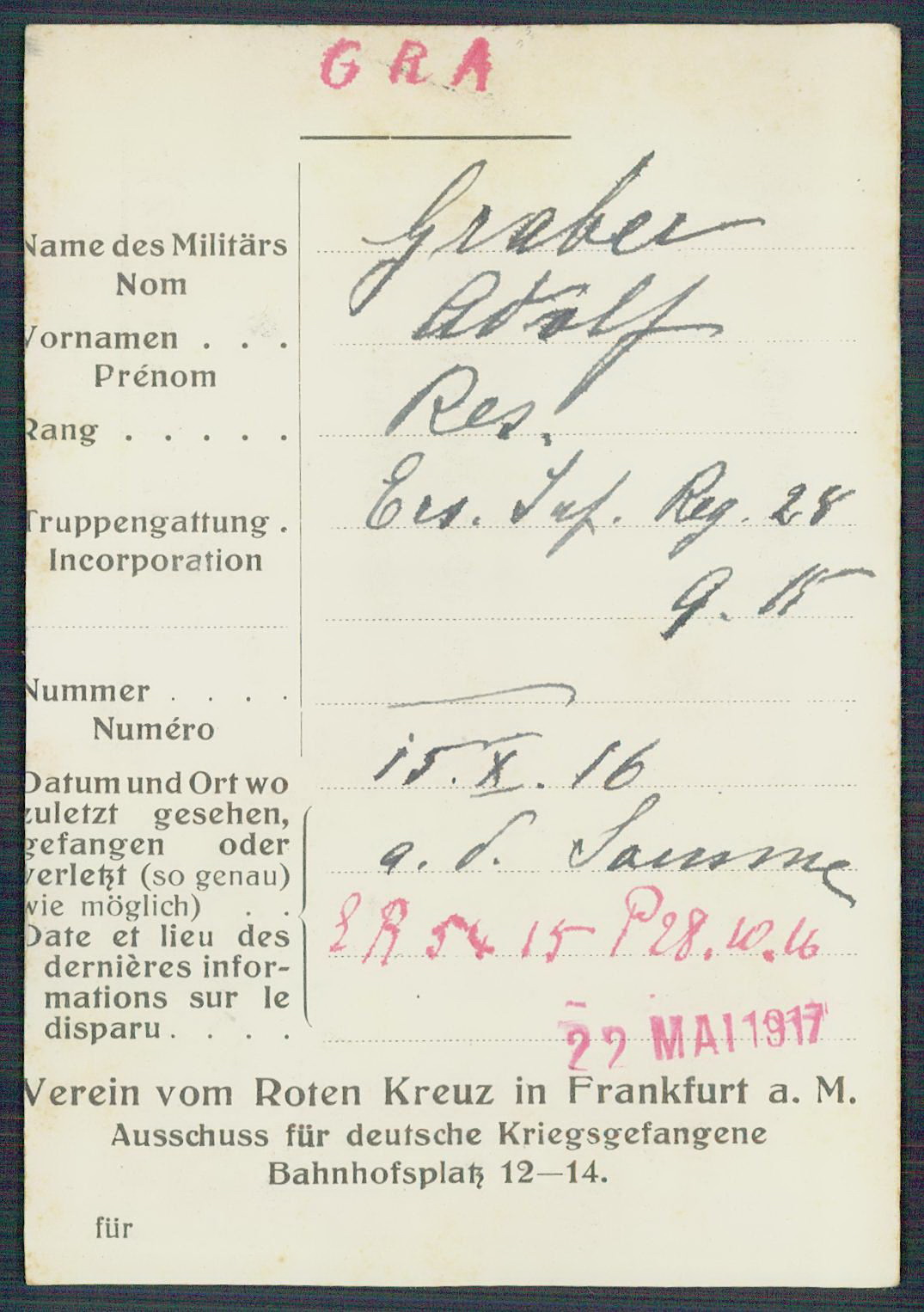 Reservist Adolf GRABER 19.04.1888 - ? aus Leutersberg Reserve Infanterie Regiment 28 galt als vermisst Gefangenschaft am 28.10.1916 an der Somme *Bruder von Albert Graber |