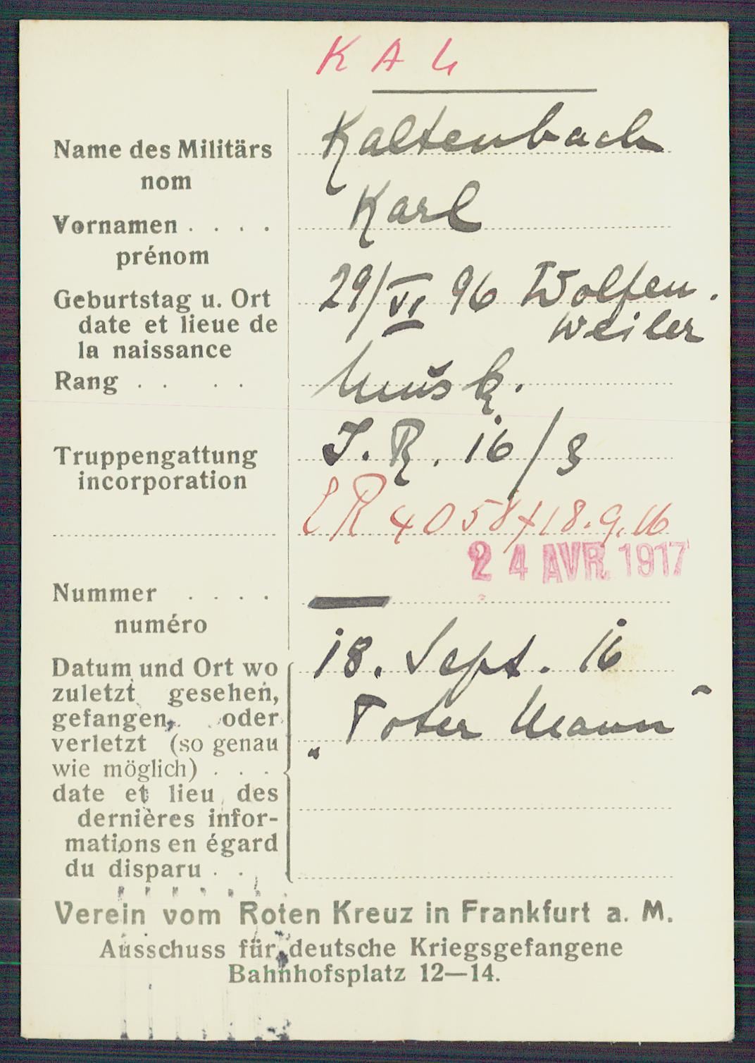 KALTENBACH 29.06.1896 - 18.09.1916 20 Jahre alt aus Wolfenweiler Infanterie Regiment 16 3. Kompagnie *Urgrossneffe der Schwägerin des Urgrossonkel 3.Grades von Fabian Coulot |