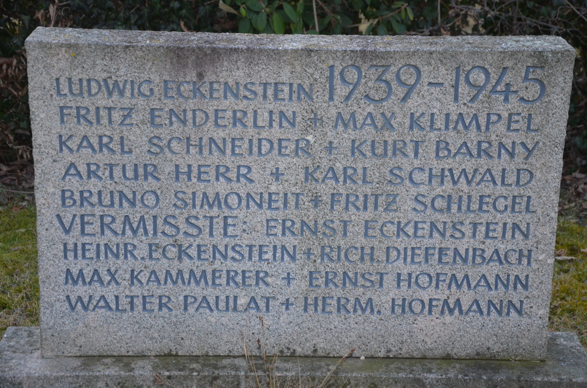 Soldat ECKENSTEIN Ernst 15.01.1910 - 01.12.1942 32 Jahre alt aus Wintersweiler Gilt als vermisst im Raum Jekaterinowka (Ukraine) Kriegsgräberstätte Charkow (RUS) Name im Gedenkbuch verzeichnet |