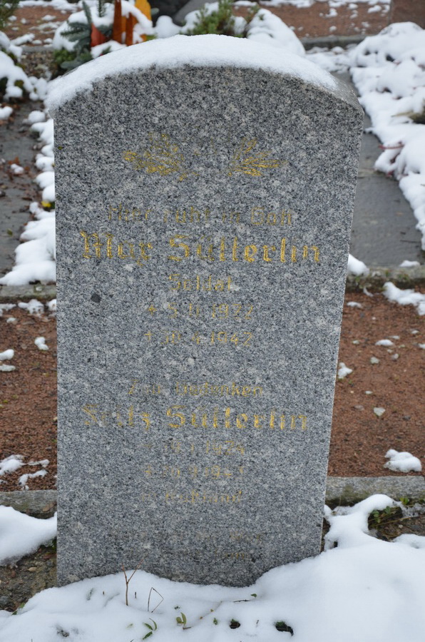 Oberwachtmeister Gustav SÜTTERLIN 05.01.1915 - 01.02.1945 30 Jahre alt aus Wollbach Gilt als vermisst aus der Gegend Ratibor (Polen) Sein Name existiert im Gedenkbuch der Kriegsgräberstätte in Siemianowice (PL) |