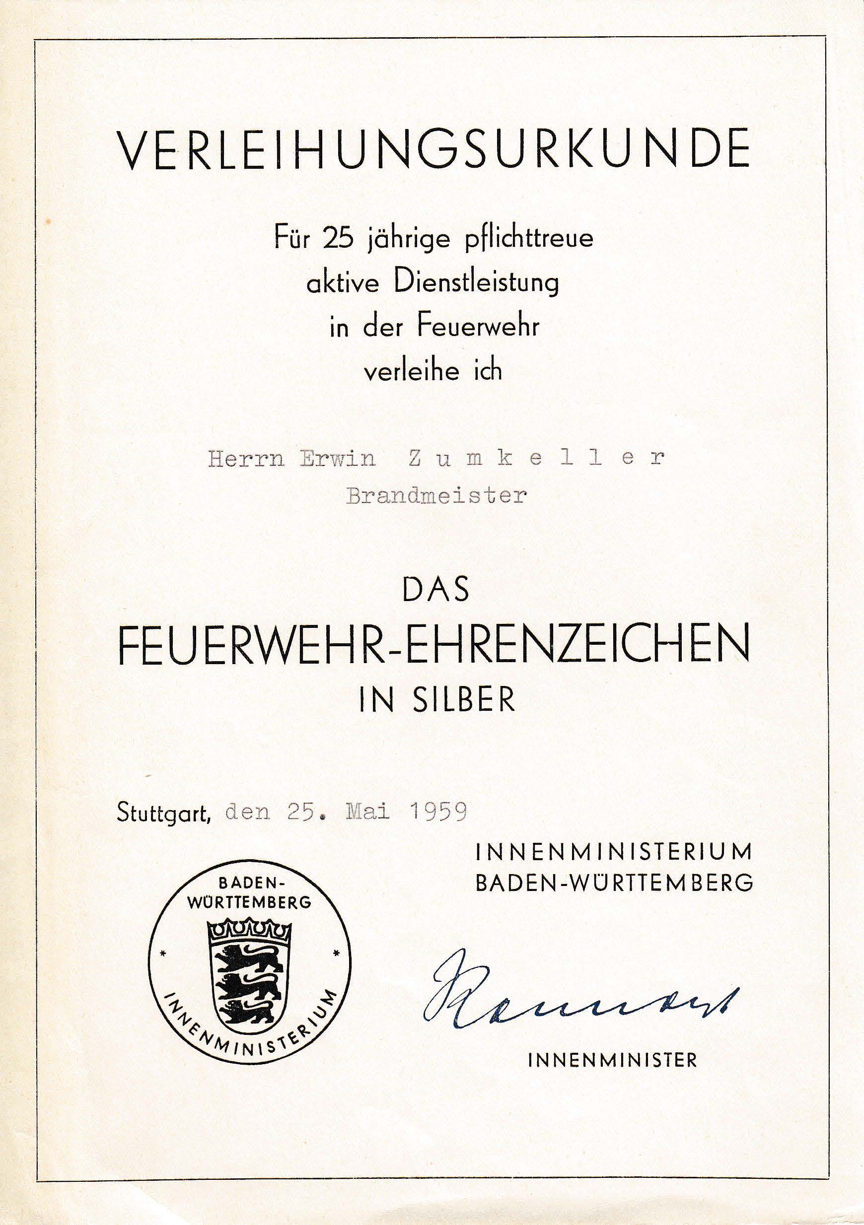 Baden-Württemberg für 25 Jahre Dienst 25.05.1959 |