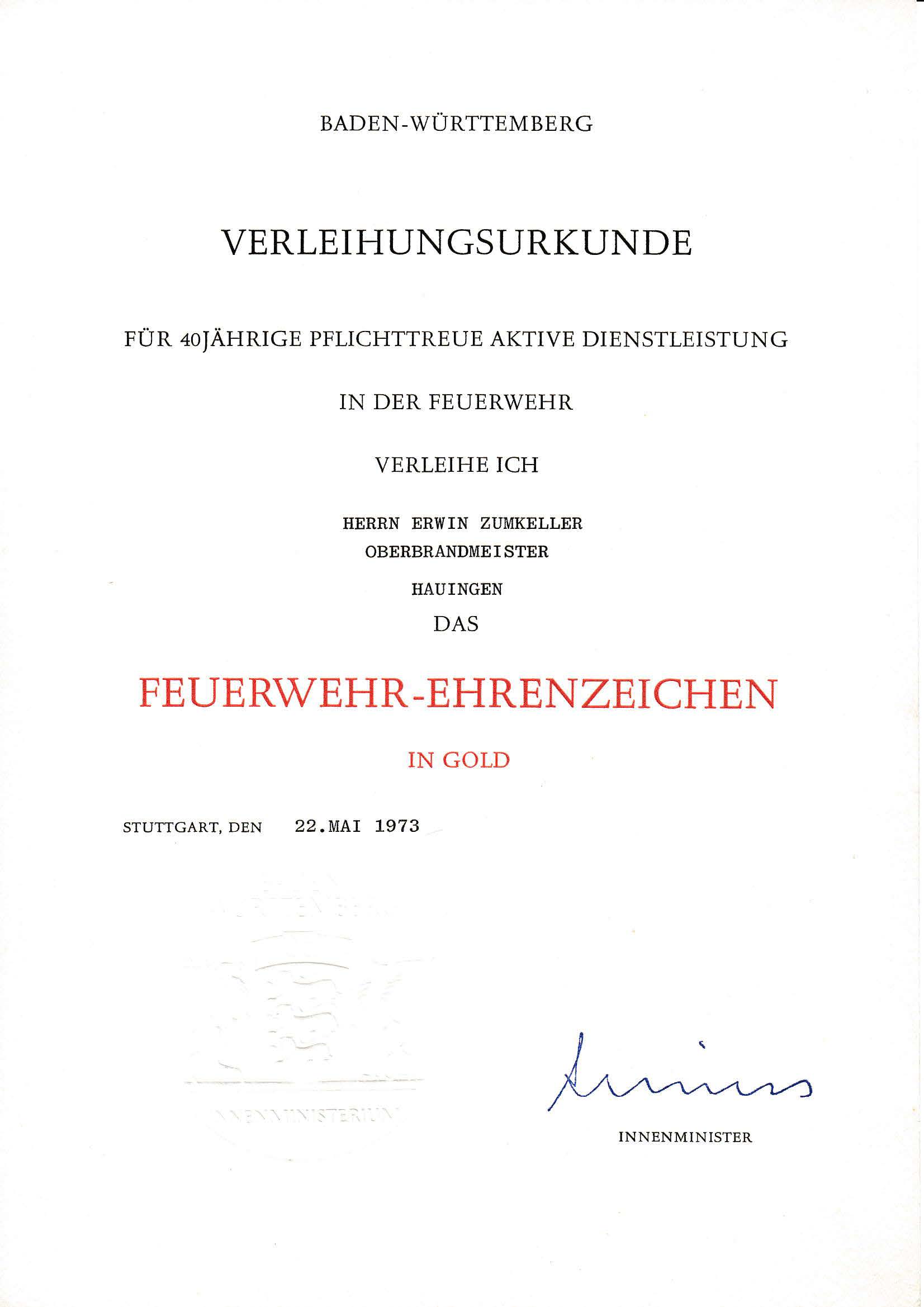 Baden-Württemberg für 40 Jahre Dienst 22.05.1973 |