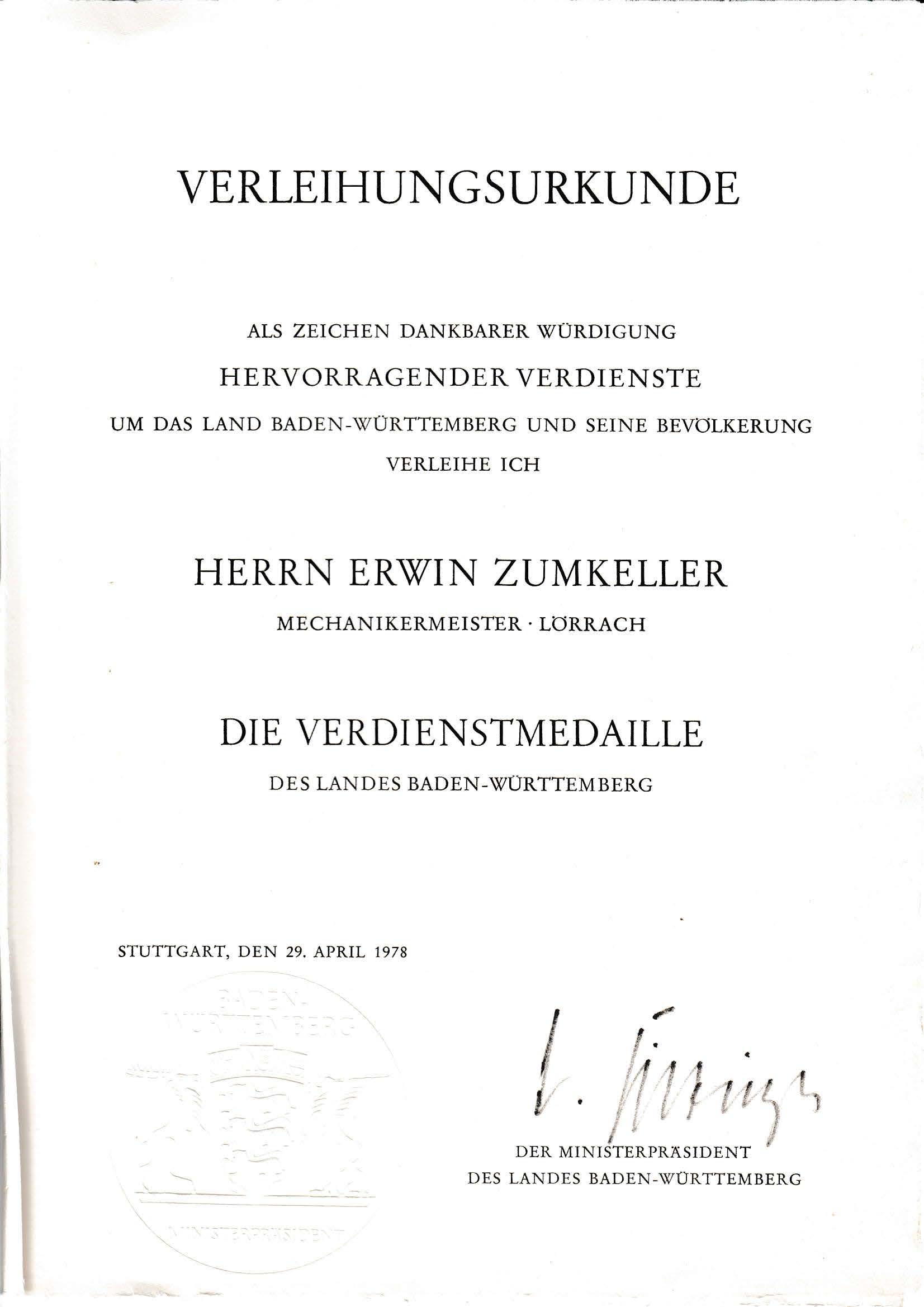 Verdienstmedaille des Landes Baden-Württemberg; Verleihung am 29.04.1978 im Schloss Ludwigsburg durch Ministerpräsident Hans Filbinger |